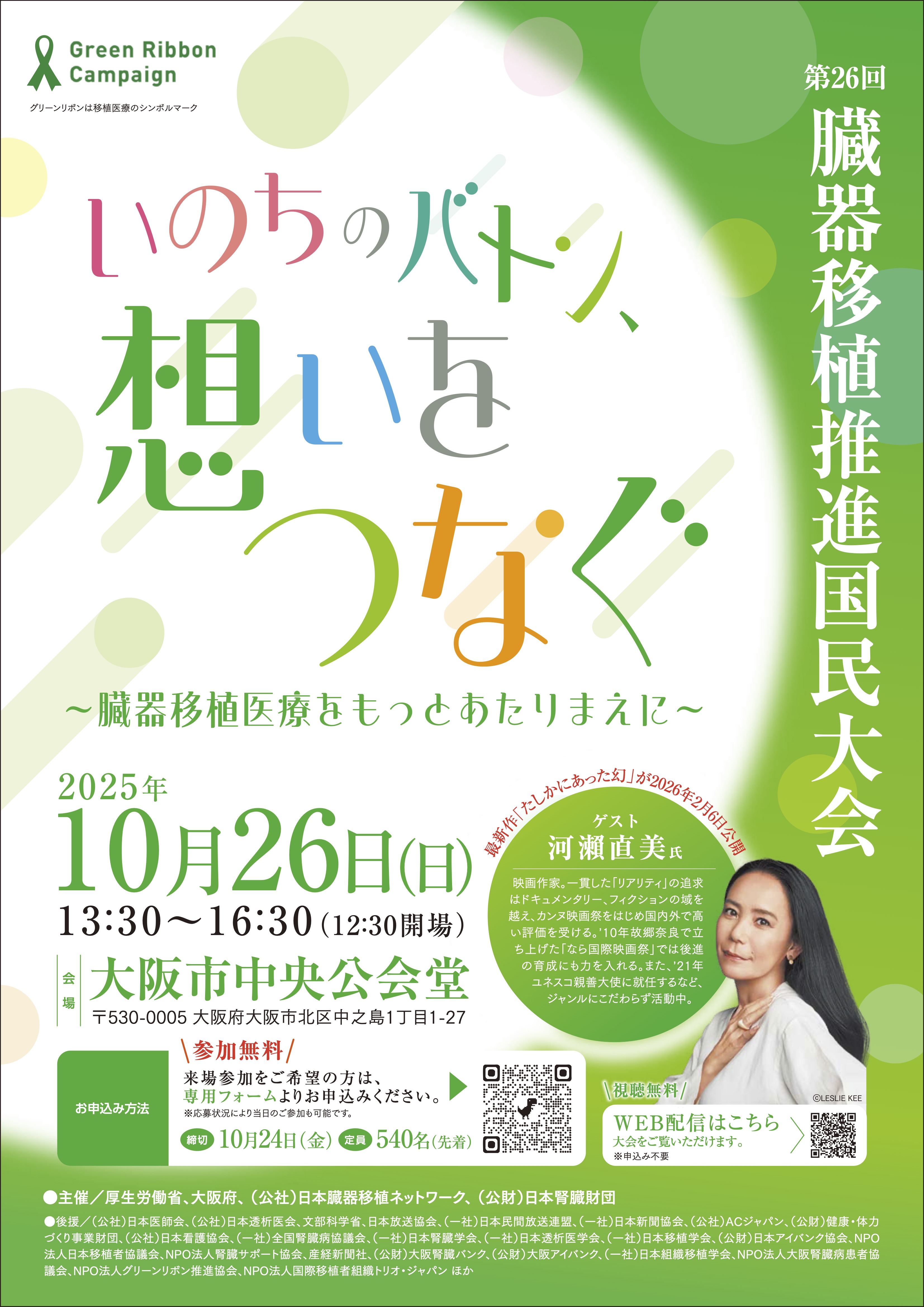 上に貼り付けた厚生労働省の公式サイトや、大阪府のサイトでも発表されましたが…10月26日(日)、大阪市中央公会堂にて開催される「第26回臓器移植推進国民大会」に登壇させていただくことが決まりました。テーマは、いのちのバトン、想いをつなぐ〜臓器移植医療をもっとあたりまえに〜というものです。厚生労働省・大阪府・日本臓器移植ネットワークなどが主催する全国的な大会で、臓器移植の普及と啓発を目的とした年に一度の大きなイベントです。
