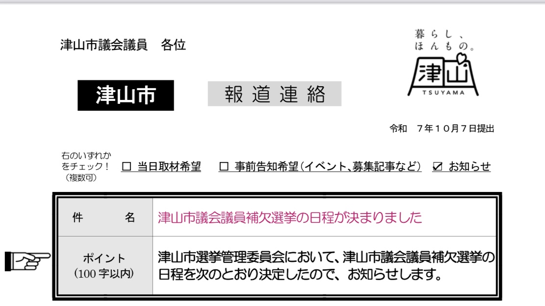 先日のブログ記事で、同僚議員の政岡哲弘(まさおか あきひろ)さんが亡くなられたことについて書かせていただいています。25名定員である津山市議会に欠員が生じているため、津山市議会議員の補欠選挙が実施されることになりました。地方自治法第113条、公職選挙法第33条等の定めに基づき、今回は来年2月の市長選挙と同じ日程で執行されるものです。選挙費用の節約や投票のしやすさを考慮して、こうした「同日選挙」が行われるケースは、全国的にも一般的なものです。