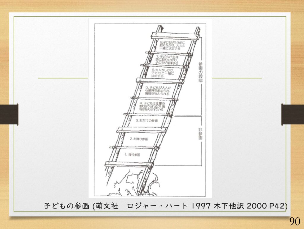 研修内では、子どもの「参画」の具合を段階的に示すロジャー・ハートのはしごについても紹介されました。