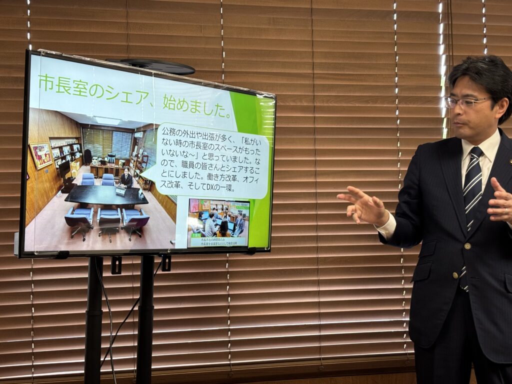 コロナ禍の際に実現したため、今では徹底されているとのことでした。そのため、各部局の皆さまの席はもちろん、市長室にも積み重ねられた重要書類などはないわけです。通常、市長室には扱いに注意を要するような紙資料も置いてあるように思われるわけですが、こうした取り組みを中途半端に終わらせず徹底することで、ついには市長室を、市長不在時には誰でも使えるシェアスペース化してしまっています。