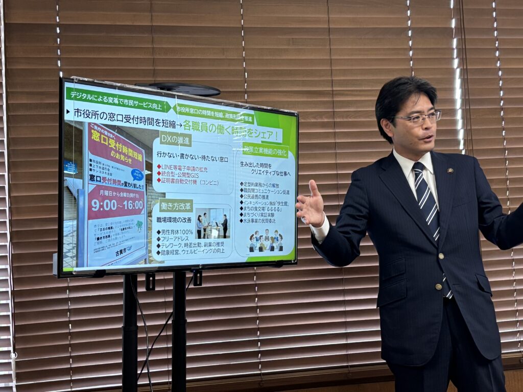 職員の皆さまの勤務時間を見直し、出勤時間を早めたり遅めたりすることで退勤時間を調整するフレックスタイム制(6:30〜10:30出勤、15:00〜19:00退勤)を導入しています。しかも”理由なんて何でも良い”とのことで…圧倒的にユーザーフレンドリーな、使いやすい制度設計になっています。育児や介護などは当然ながら、ジムに早く行きたいからとか、ライブに行くためだとか…何だって構わない、それぞれに優先したいものがあるんだからとのことでした。テレワークも市長みずから積極推進しており、徐々に増えてきているとのことです。