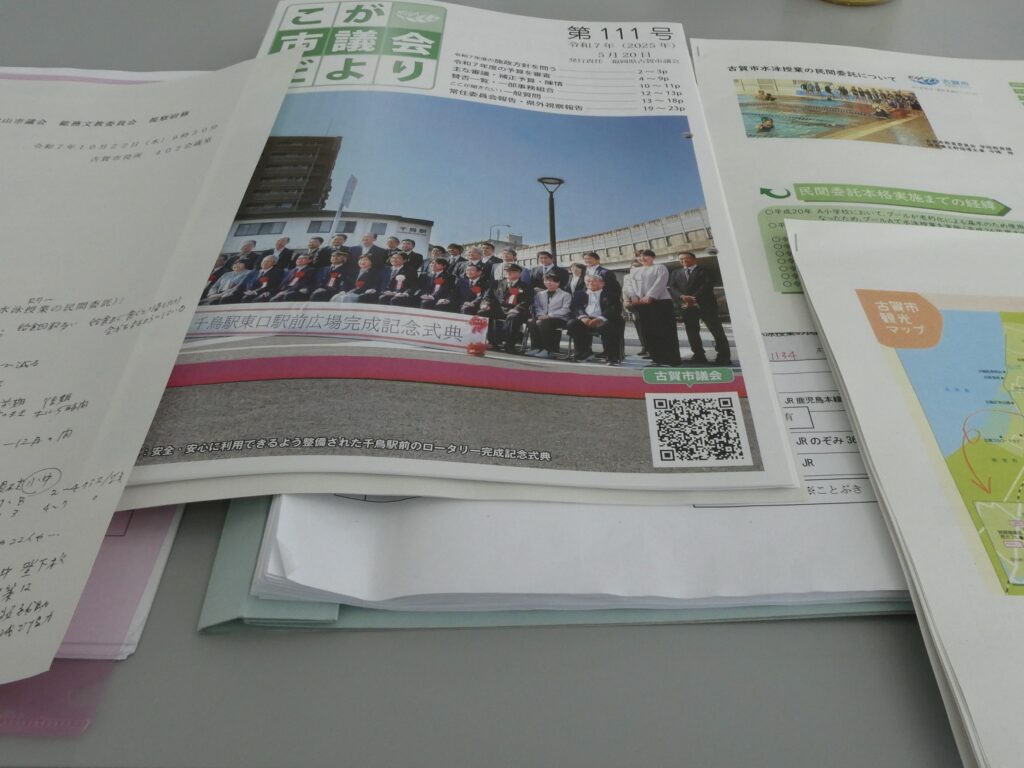 本日は福岡県古賀市への視察報告について。