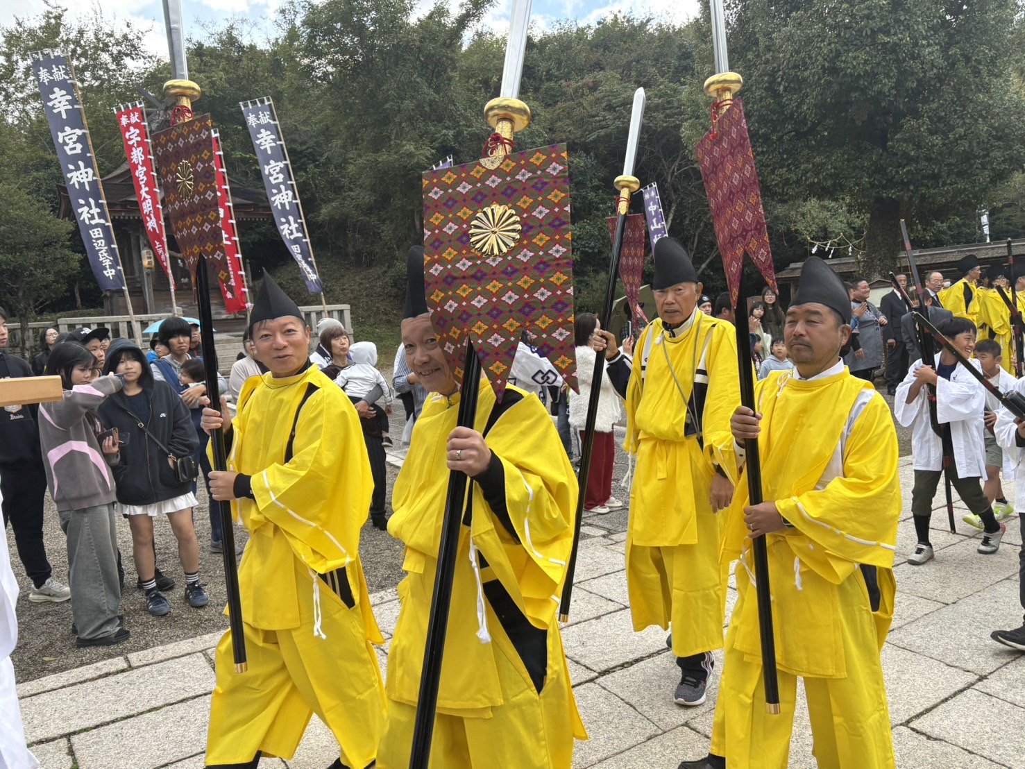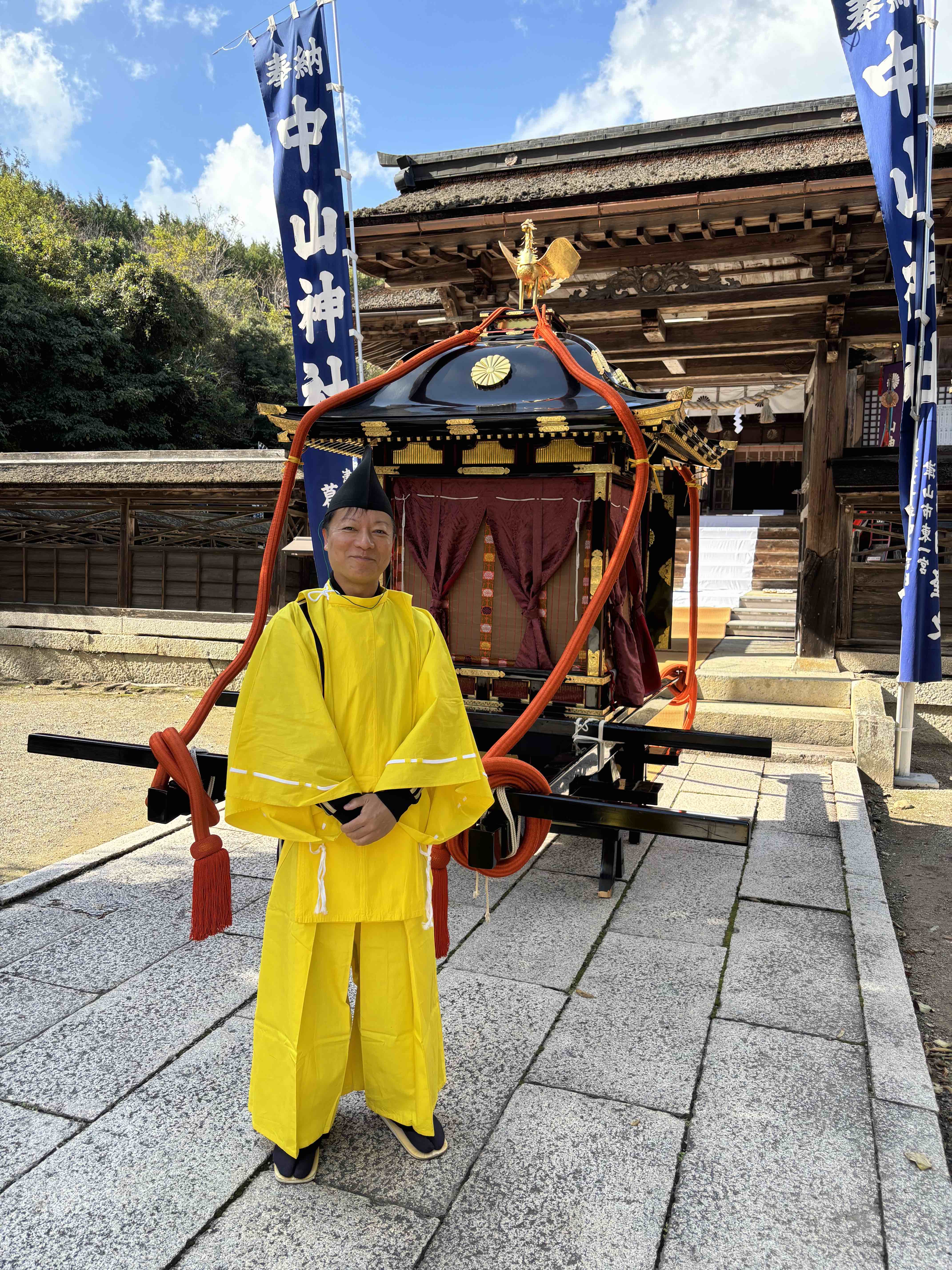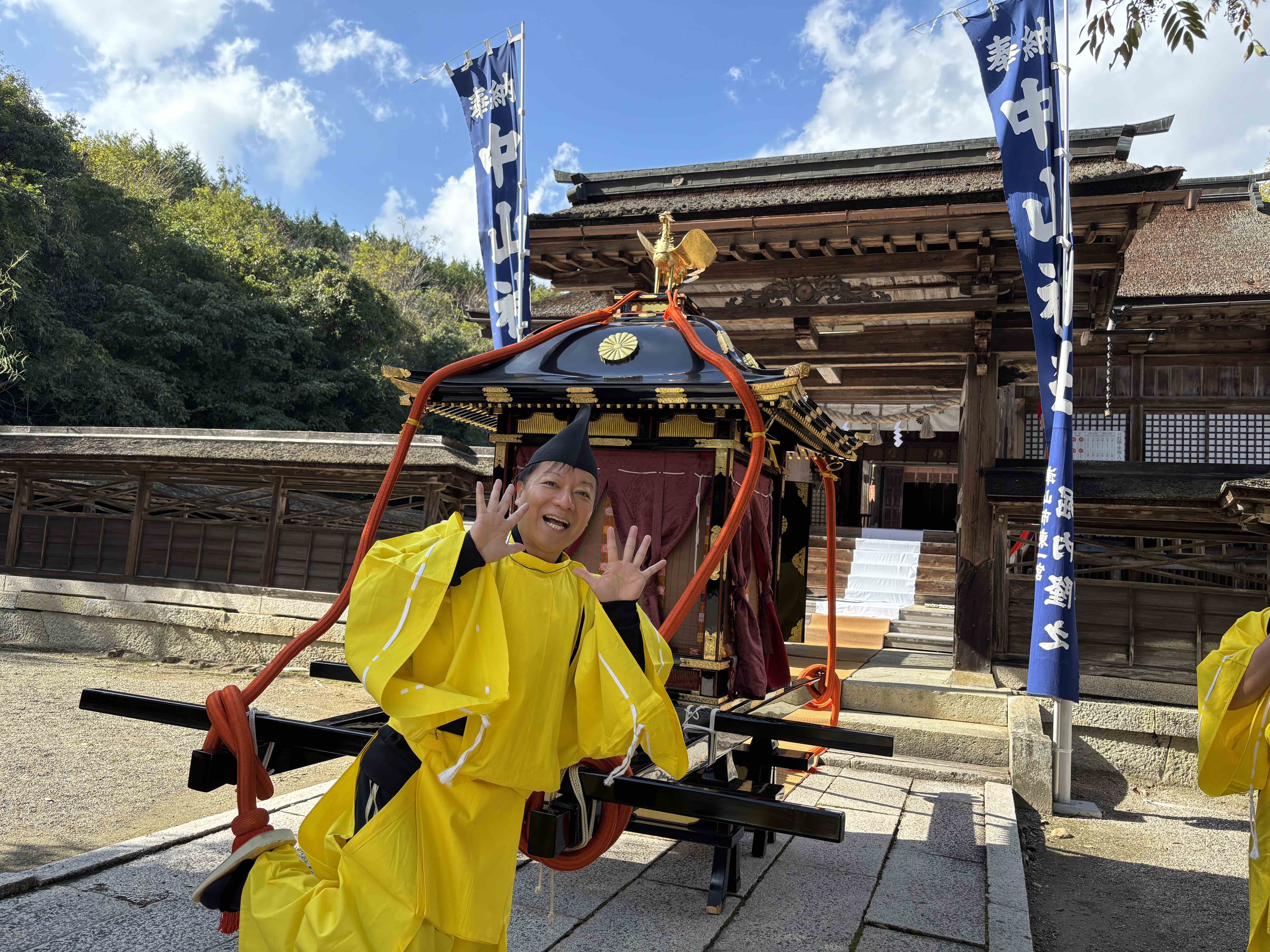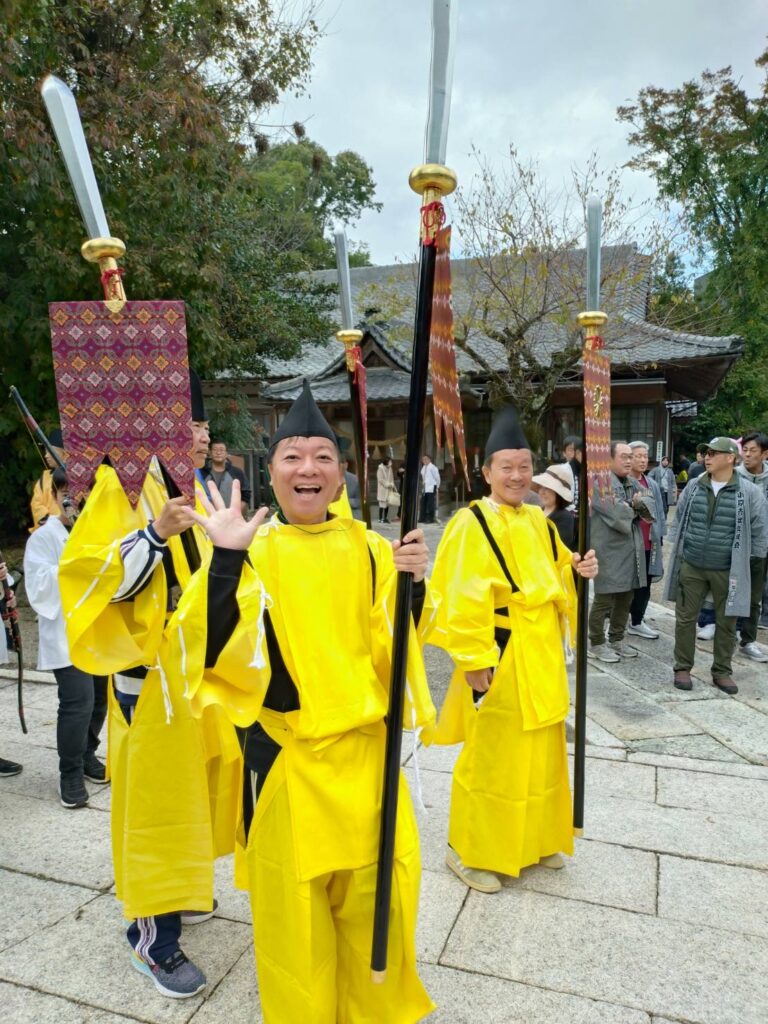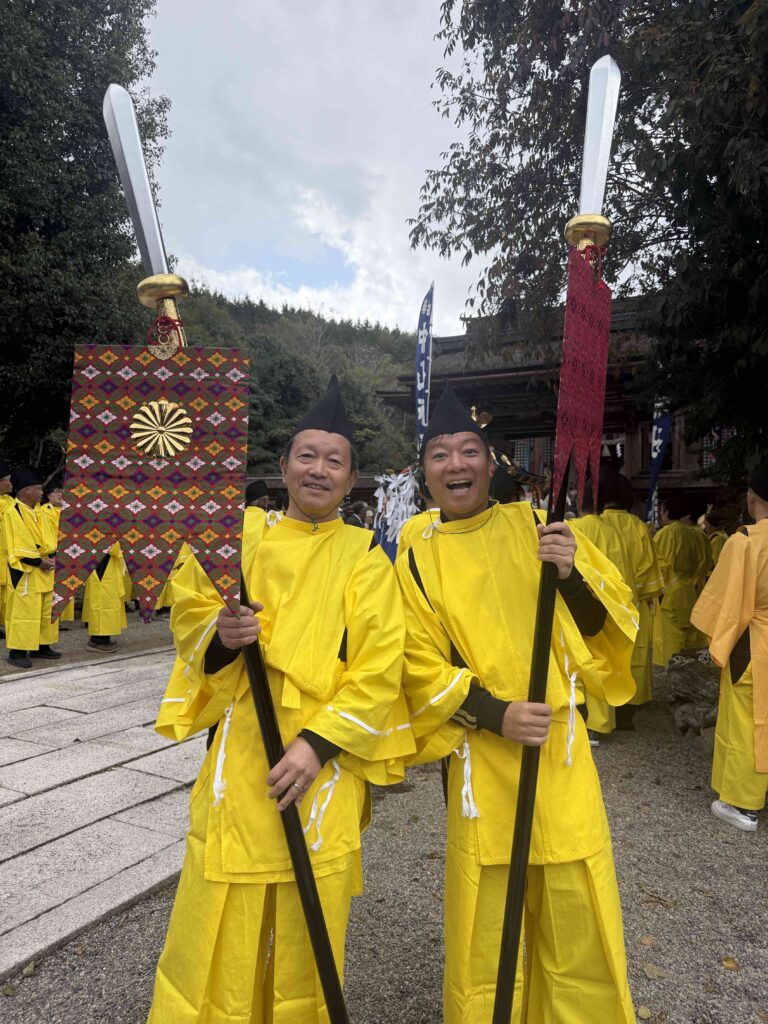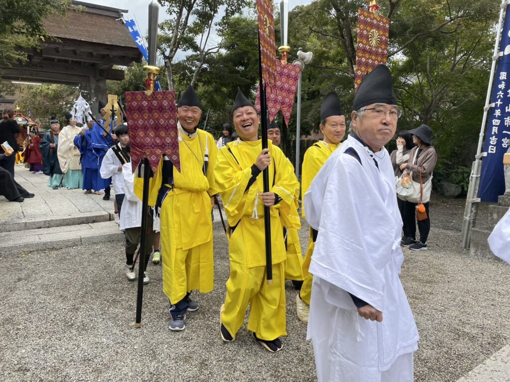 昼前に終了した神事のあと、一旦帰宅して、スーツ姿からジャージ姿に着替えて再び神社へ…そして、御神幸の行列の一員としての衣装に着替え、皆さまと練り歩き、この姿での再びの玉串奉奠などもさせていただき…夕刻に解散するまで楽しい時間を過ごさせていただきました。今年も運動不足の体には堪える一日だったのは正直なところです。ただ昨年も書いたように祭りを運営している中心の皆さまが、私たちよりもさらに上の世代の皆さまであることに鑑みても、伝統文化を守っていくためにはやはり、持続可能なあり方を真剣に考えていかねばならない段階に入っていると改めて感じました。