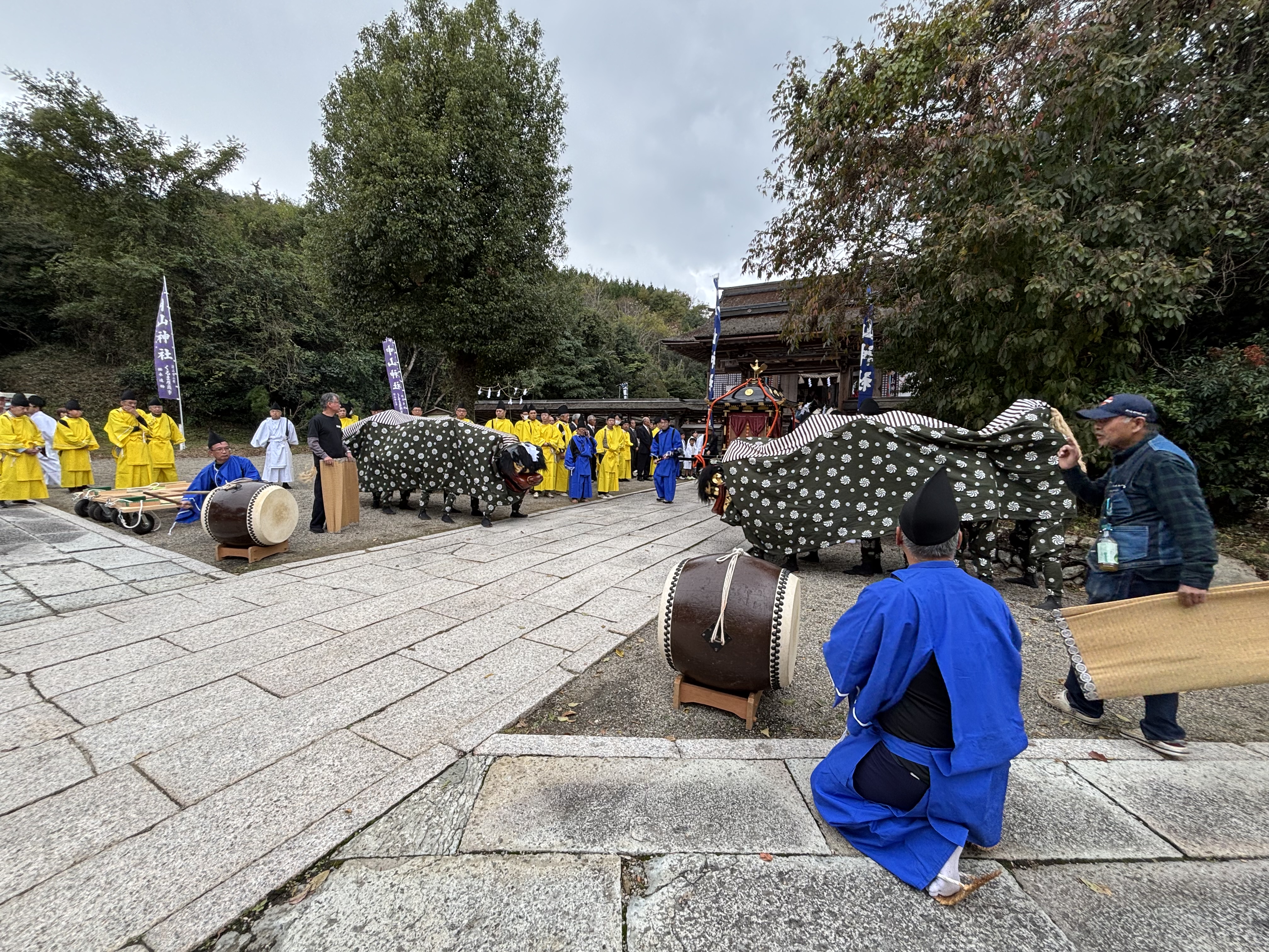 本祭り当日となった今日は、朝からかなり雨が降っていました。ただ10時半から執り行われた神事を前に降りやみまして…これも”おかげ”の一つの形かななどと思った次第です。風が強く、非常に冷たい空気が張り詰める中で玉串奉奠などさせていただく、厳かな雰囲気の中での神事でしたが…正直言って(寒過ぎる!)というのが、多くの参加者の心の声だったとは思います。
