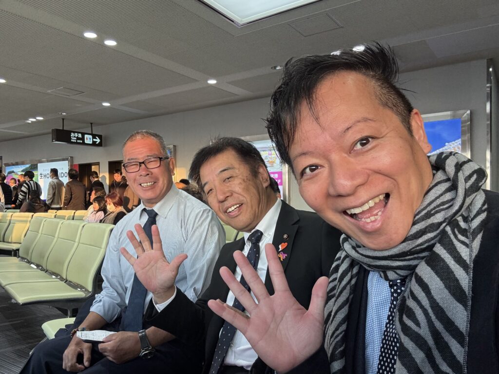 今回は空路を選んだために訪れた岡山空港でにて…かねてより親交のある真庭市議会の緒形副議長と柴田議員にバッタリお会いしたのです。お二人は明日の地方議会サミットにも出席してくださるとのことでしたが…今日のところは東京・中野区での視察のために、同じ機で東京に向かわれるところでした。話を伺ってみると、本来はもう一方ご一緒される予定だったものの、公務のために急遽都合がつかなくなり、2人での視察になったとのこと。