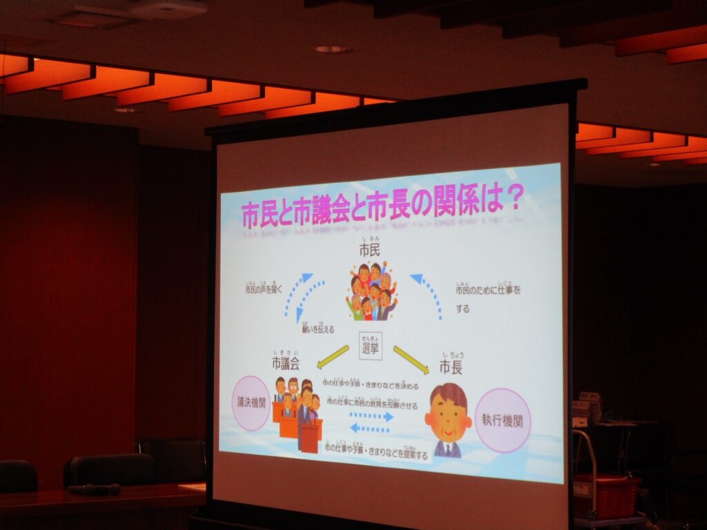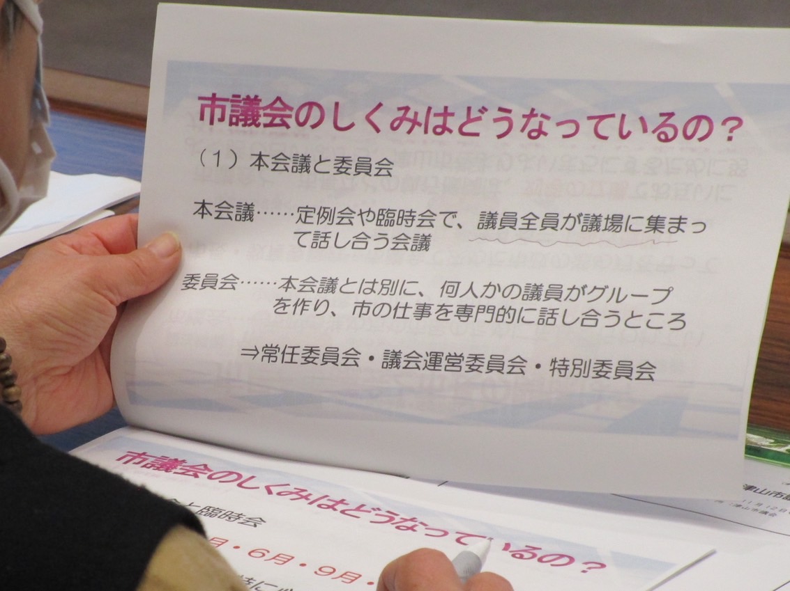そして議会事務局次長から津山市議会についての丁寧なレクチャーがありました。津山市議会の公式サイトで公開しているキッズページ、子どもたち向けの説明の際に使っている資料をベースに、大人向けにアレンジした内容で、とてもわかりやすくまとまっていたと思います。あれは誰がまとめたのか確認するのを忘れていましたが…個人的にも今度使わせてもらおうかしらと企んでいます。