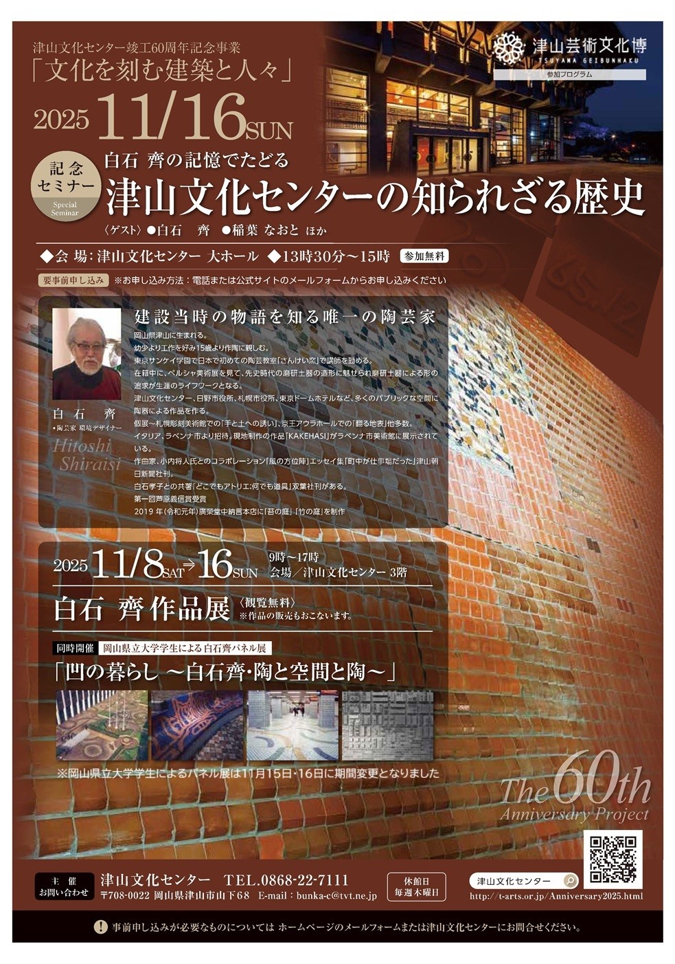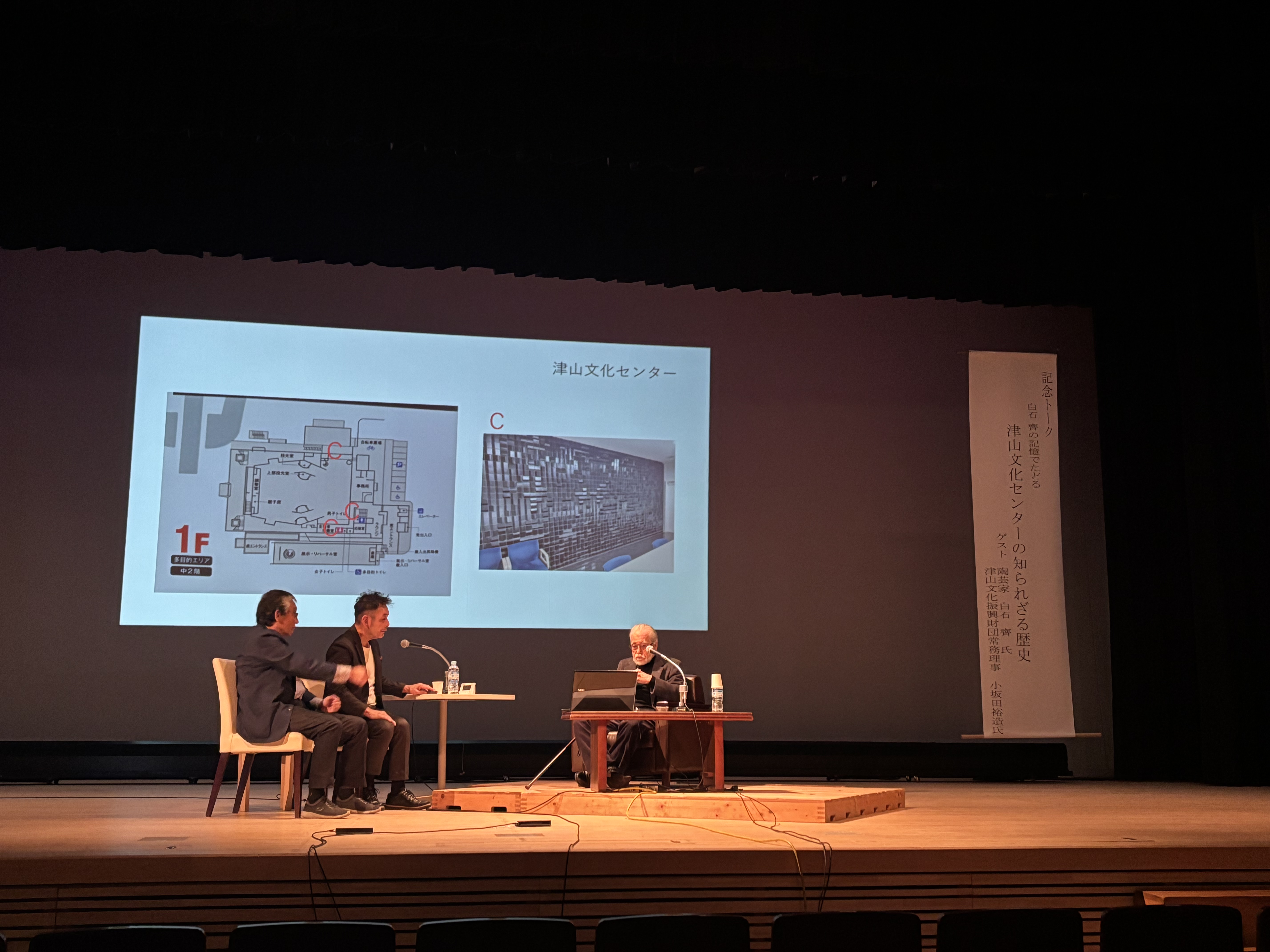 ・そして竣工60周年を迎える建物ができる際、ホワイエのレリーフや館内各所のタイル作品などを手がけられた手掛けられた、建設当時を知る陶芸家の白石齊さんが登場して、「昭和から今に続く、津山の文化と建築の物語」を、生々しい“当事者トーク”で聞かせてくれる。