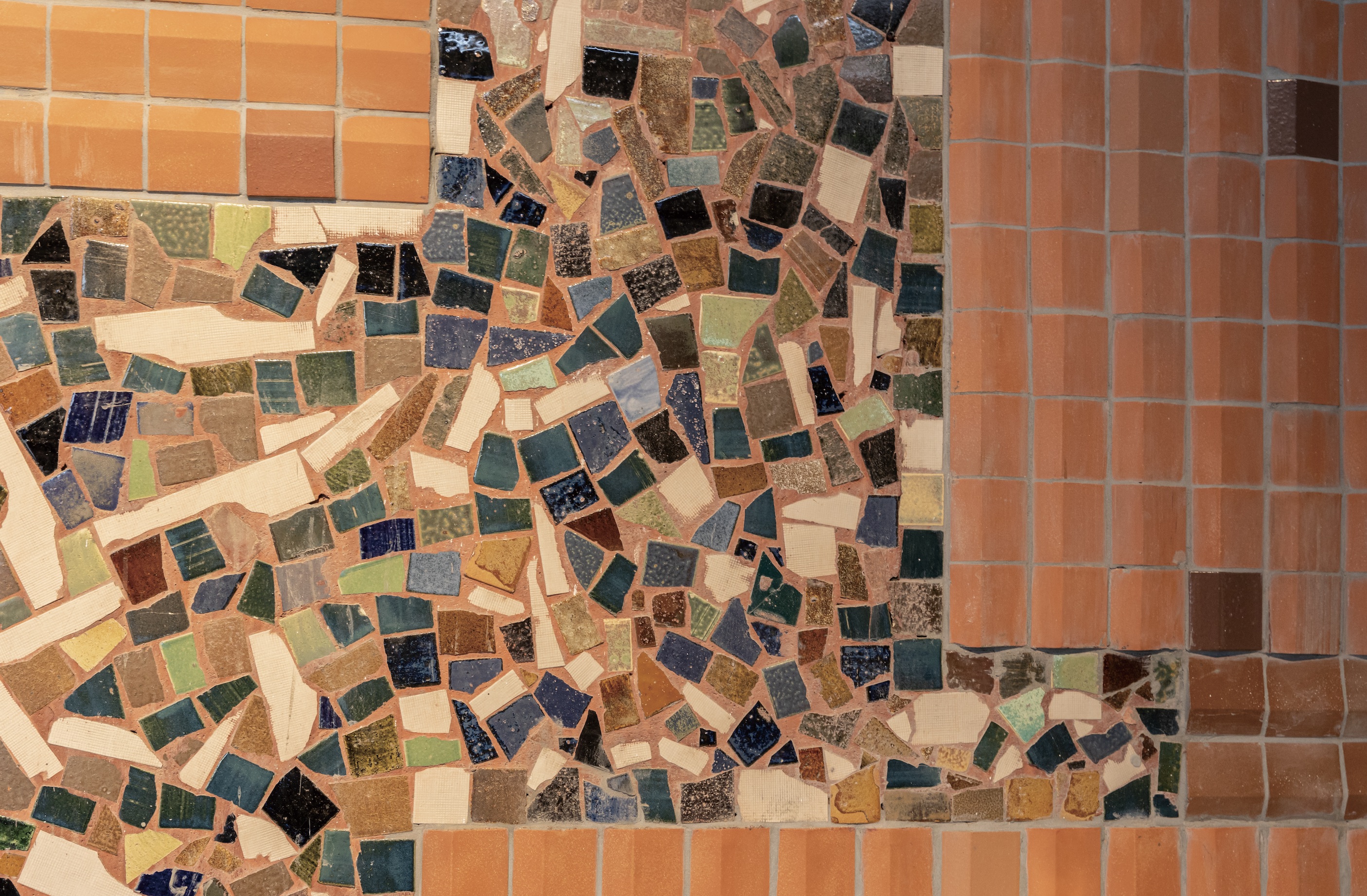 光の当たり方で表情が変わる、あの味わい深い様々な色と形のタイルたち…実は何と、試作品や残り物のタイルを、全国からかき集めて運賃だけで送ってもらったものなんだそうです。潤沢に資金を費やせる状態ではなかったという理由もあり、最低限の統一感を出すために白・グレー・グリーン・ブルー系に色を絞って、残り物をうまく組み合わせることで独特の質感とリズムを持つ壁面を作り出されたとのこと。白石さんご本人はケロッとして、「貧乏じゃないと、こんなやり方は思いつかないよね!」ってな調子で笑い飛ばされていましたが…。