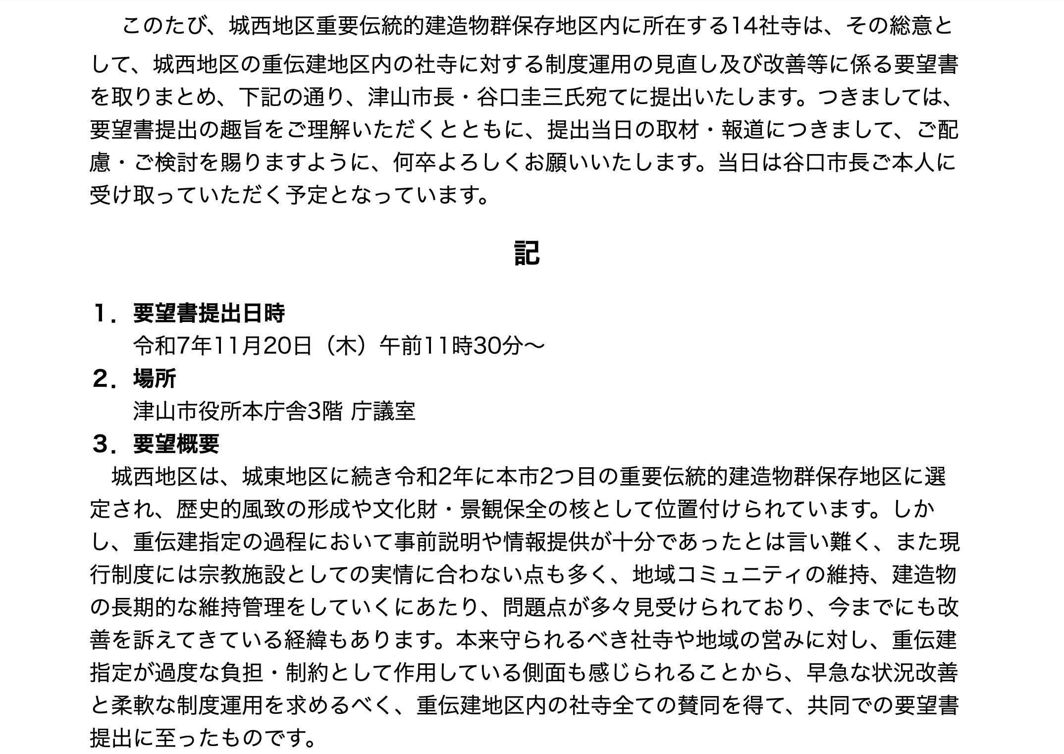 城西エリアの重要伝統的建造物群保存地区内にある14の社寺、全ての皆さまの総意ということでまとめていただいた要望内容を、市に対して提示したということです。いよいよ”現場の総意”がカタチとして示されたわけで、津山市がどのように受け止め、対応していくのかは議会においてもしっかり確認する必要があると考えていますし、今後も注視していくつもりでいます。
