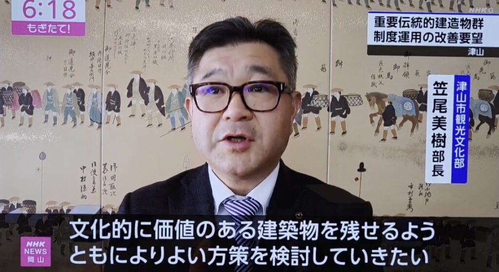 津山市の城西地区は、令和2年に城東地区に続いて市内2つ目の”重要伝統的建造物群保存地区(重伝建)”に選定されたエリアです。出雲街道沿いの商家町と、津山城下最大級の寺町がセットになった、まさに“文化都市・津山”を象徴する地域の一つであり、そして上の動画からも明らかなように、谷口市長としてもこの指定を受けたこと自体を大きな成果だと自認しているわけです。