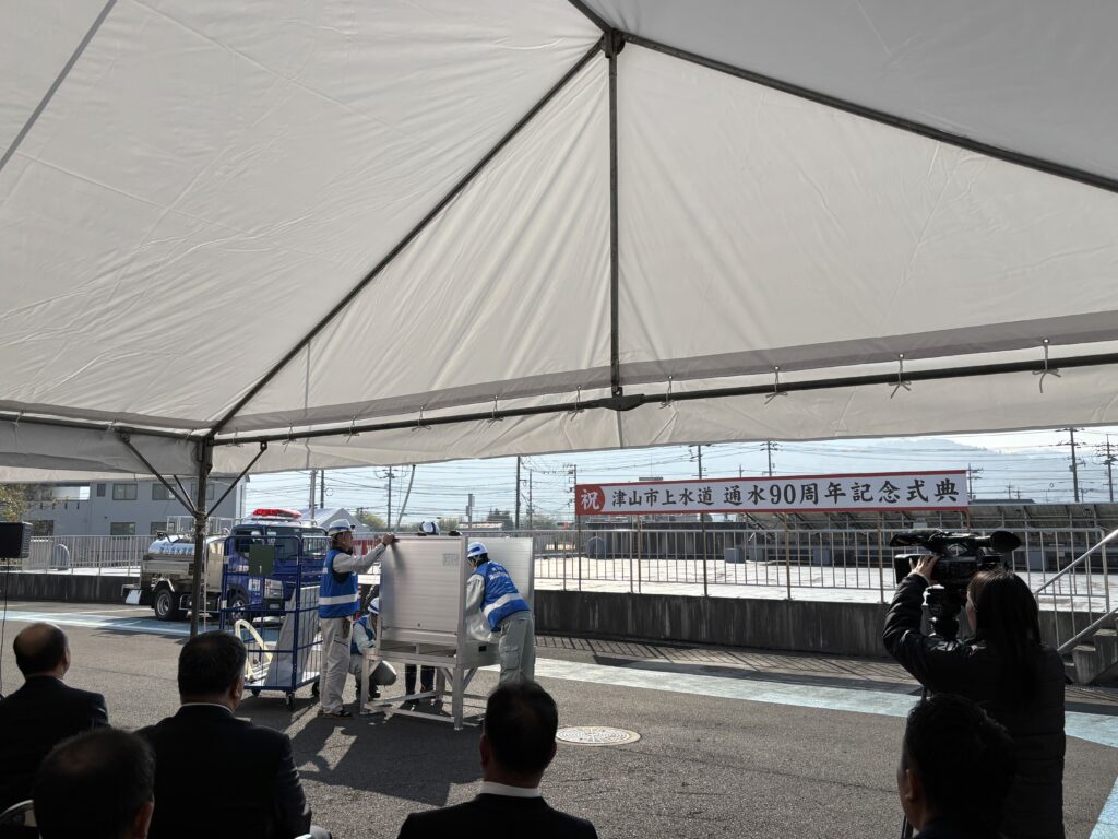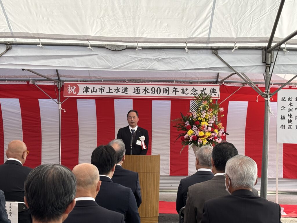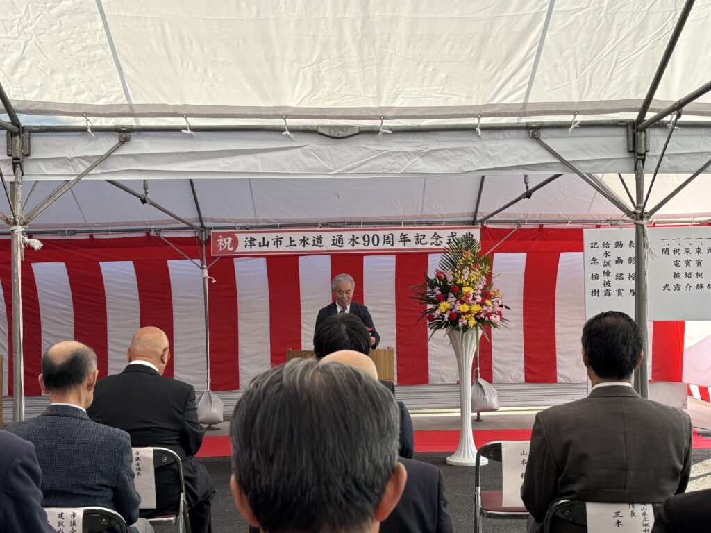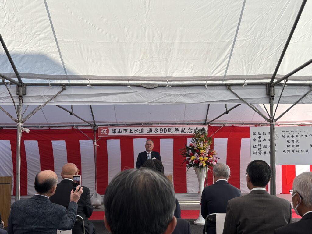 津山市議会からも議長より、昭和・平成・令和の3時代を通じて事業を守ってきた努力への敬意、気候変動による豪雨・渇水や地震リスク、施設・管路の老朽化、人口減少による料金収入の減少といった課題を共有しつつ、「次の100年に向けて、新たな一歩を」という前向きなメッセージが述べられました。