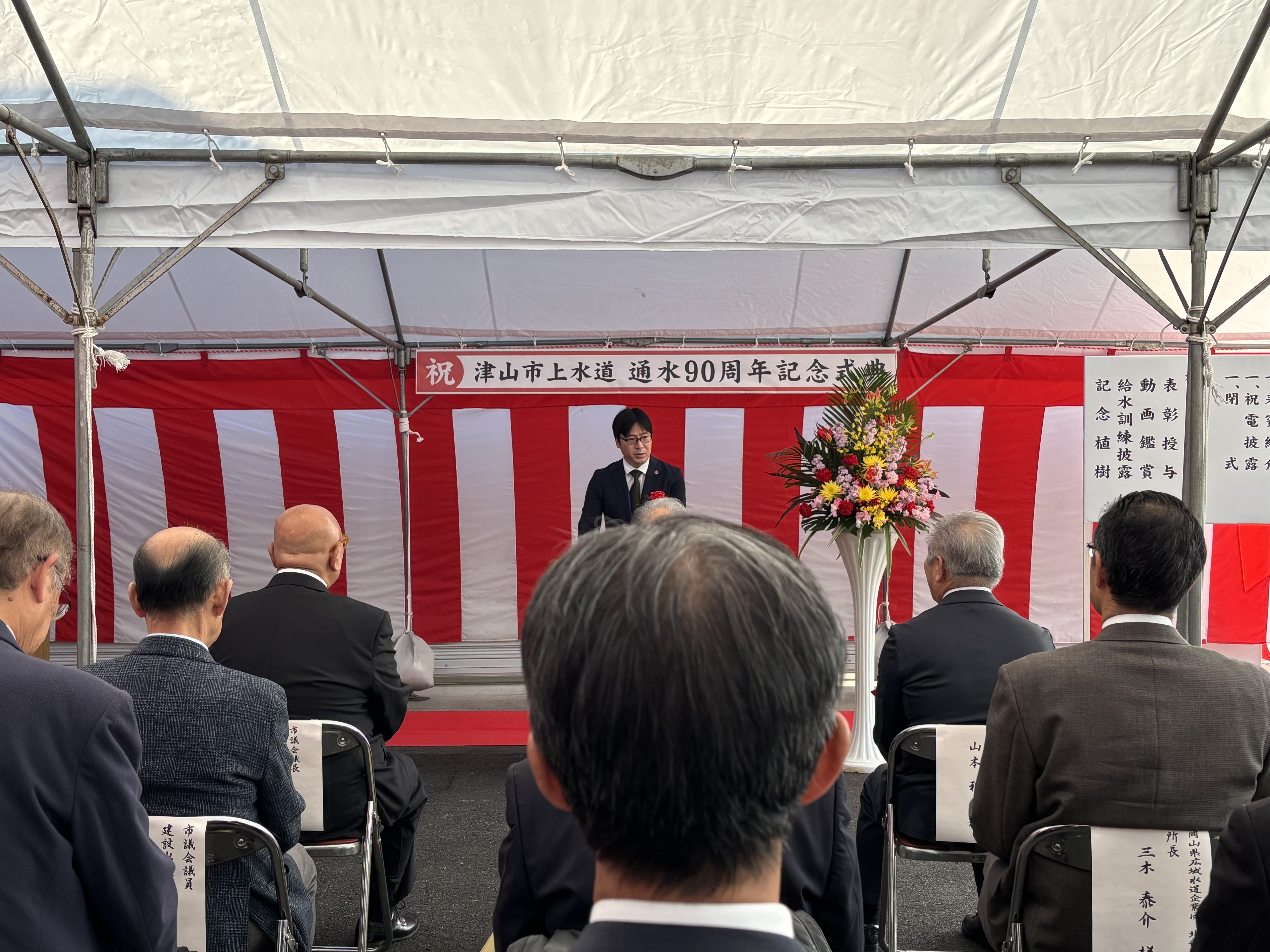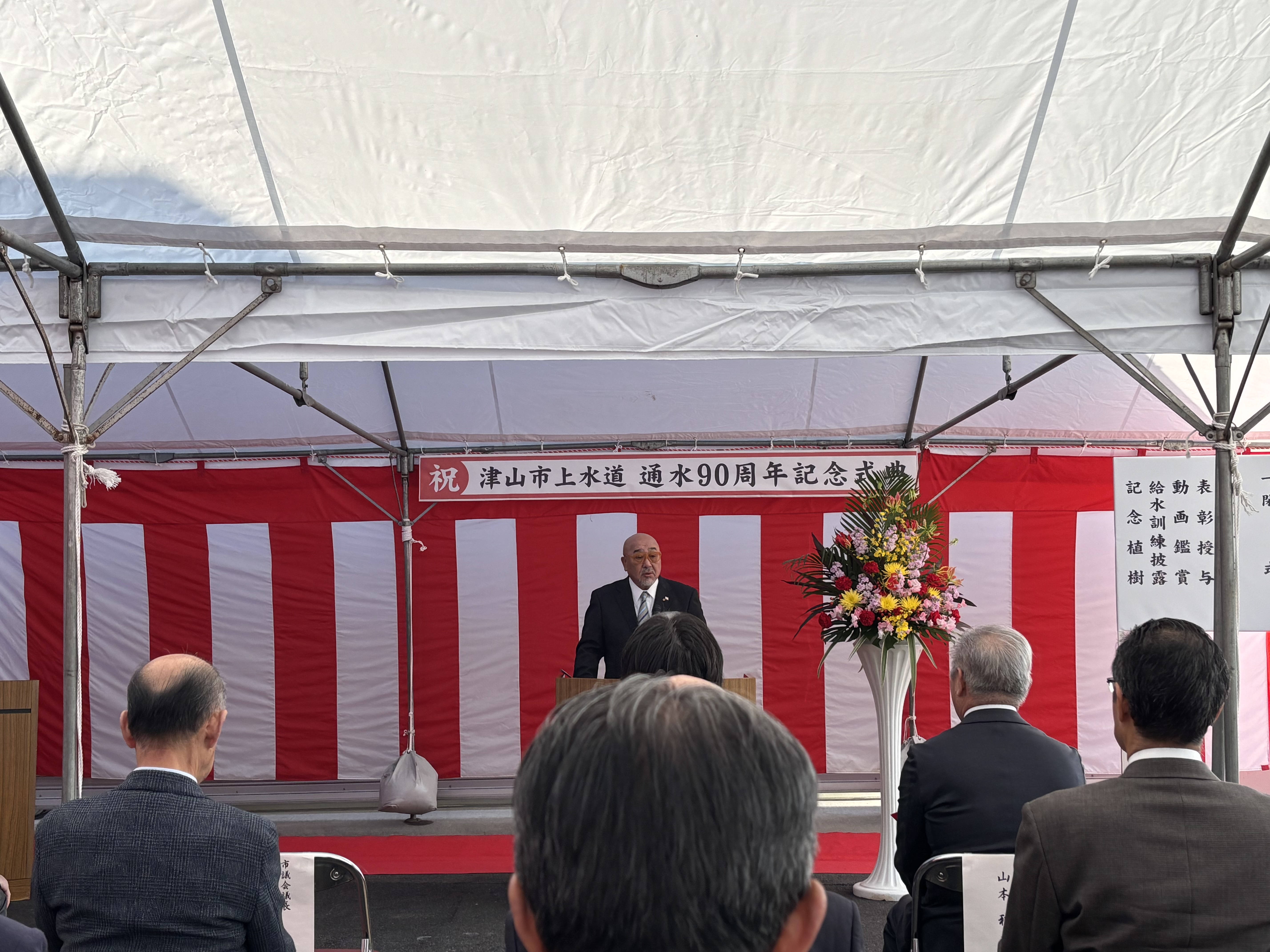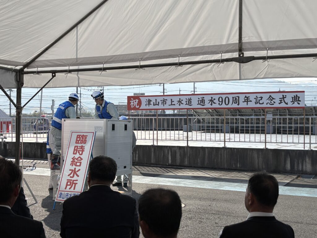 津山市議会からも議長より、昭和・平成・令和の3時代を通じて事業を守ってきた努力への敬意、気候変動による豪雨・渇水や地震リスク、施設・管路の老朽化、人口減少による料金収入の減少といった課題を共有しつつ、「次の100年に向けて、新たな一歩を」という前向きなメッセージが述べられました。