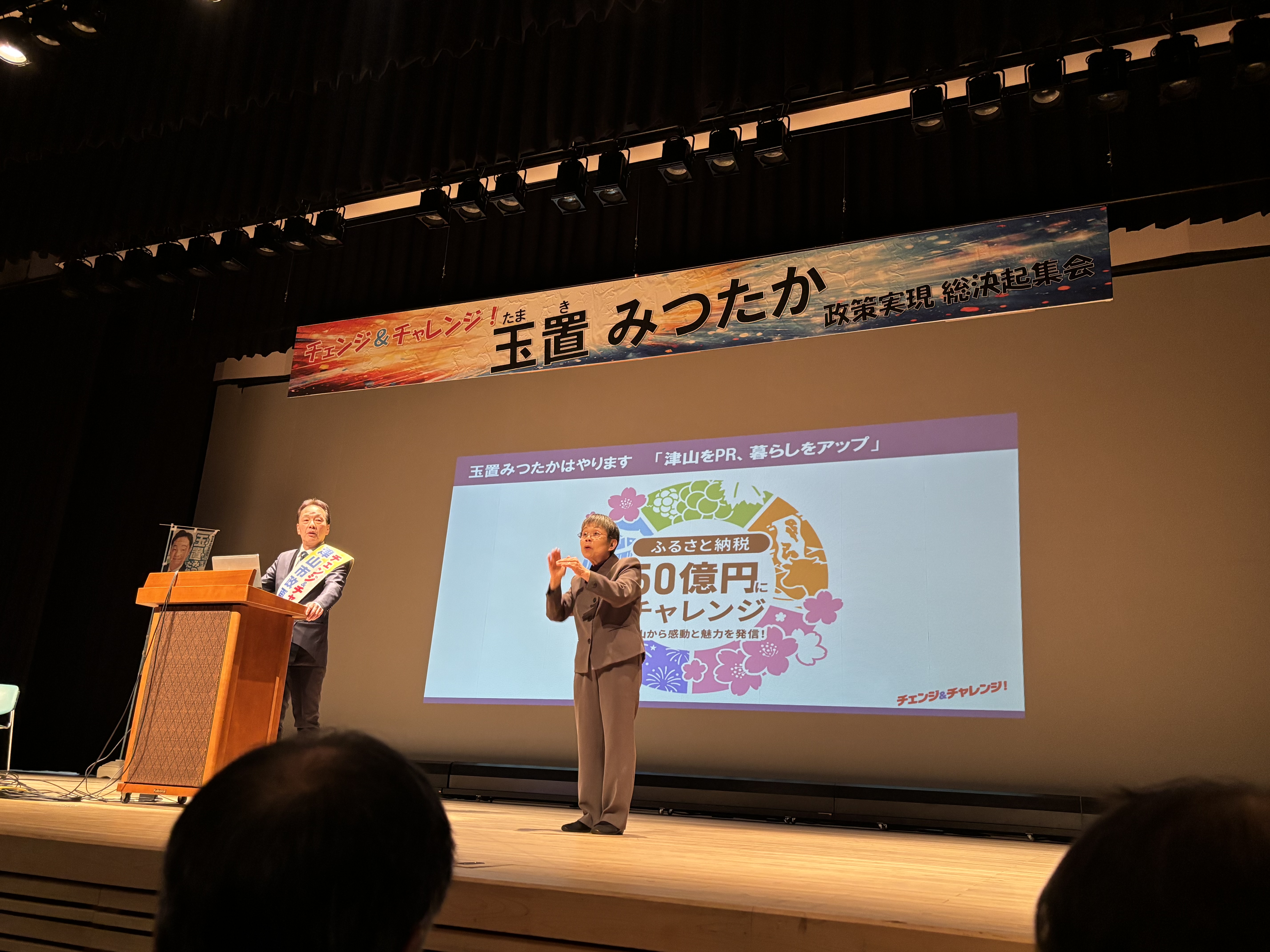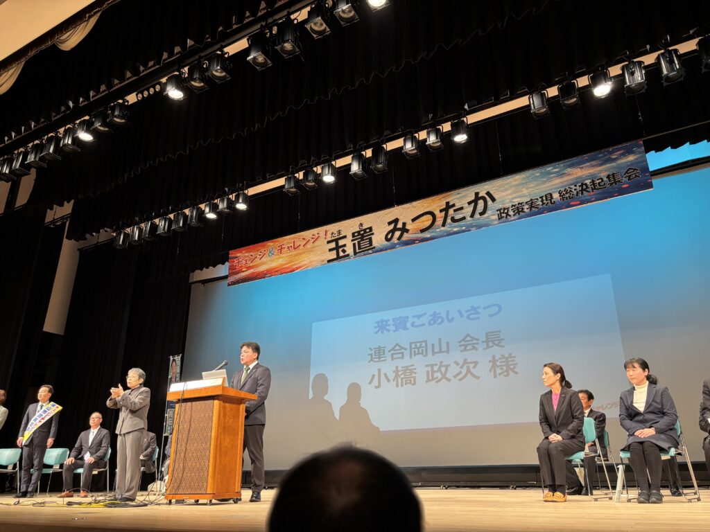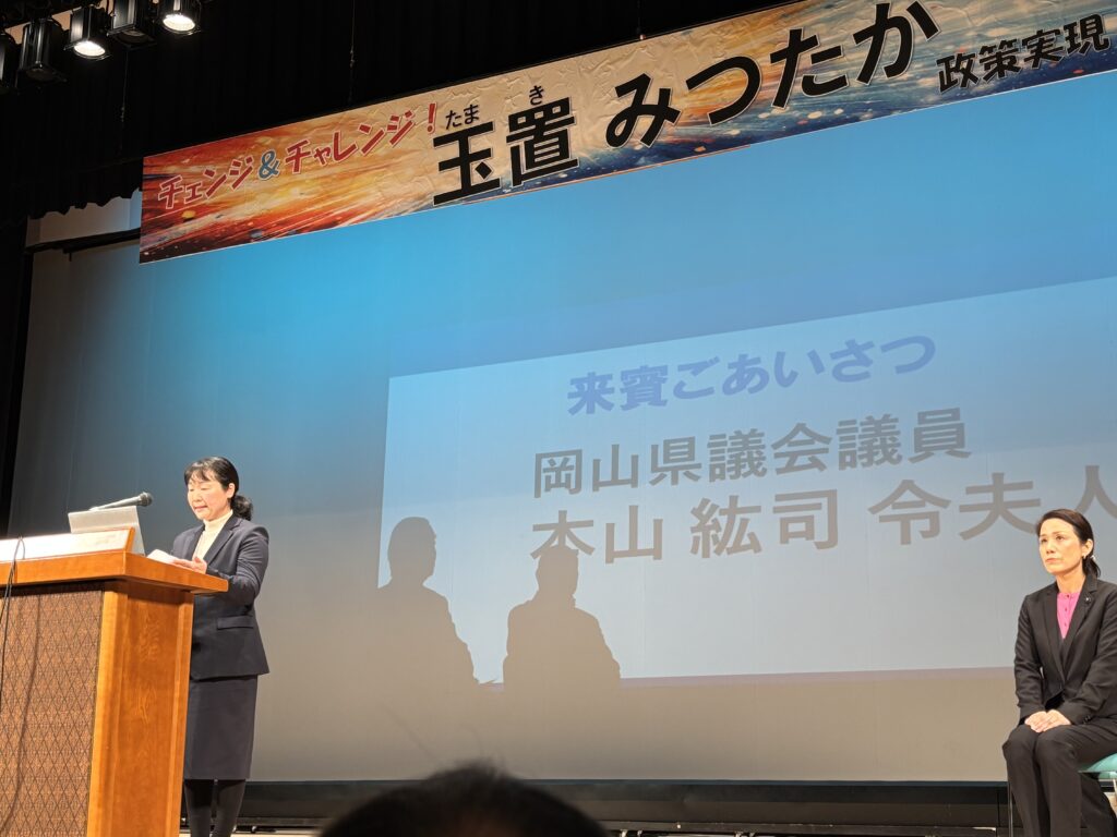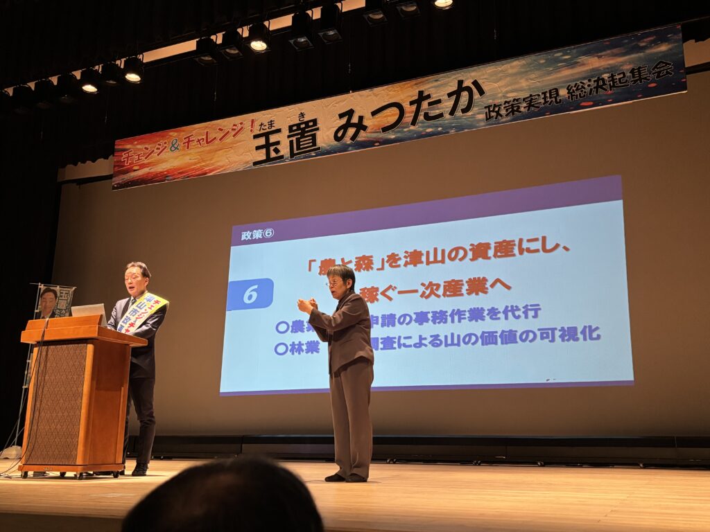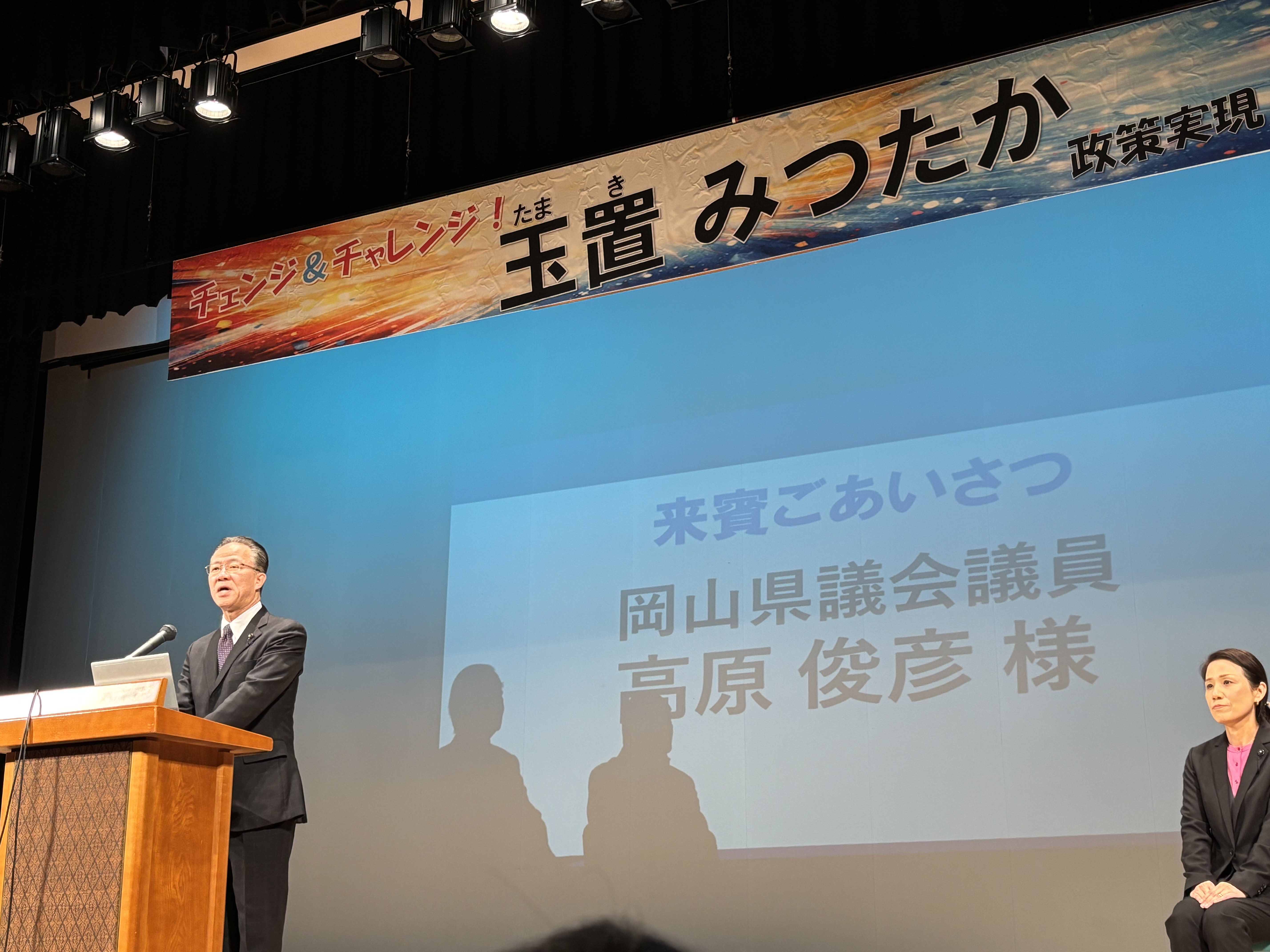 本日は、怒涛のハードスケジュールでしたが…メイントピックは何と言っても、津山市長選挙への挑戦を表明されている、玉置みつたかさんの”政策実現総決起集会”でした。