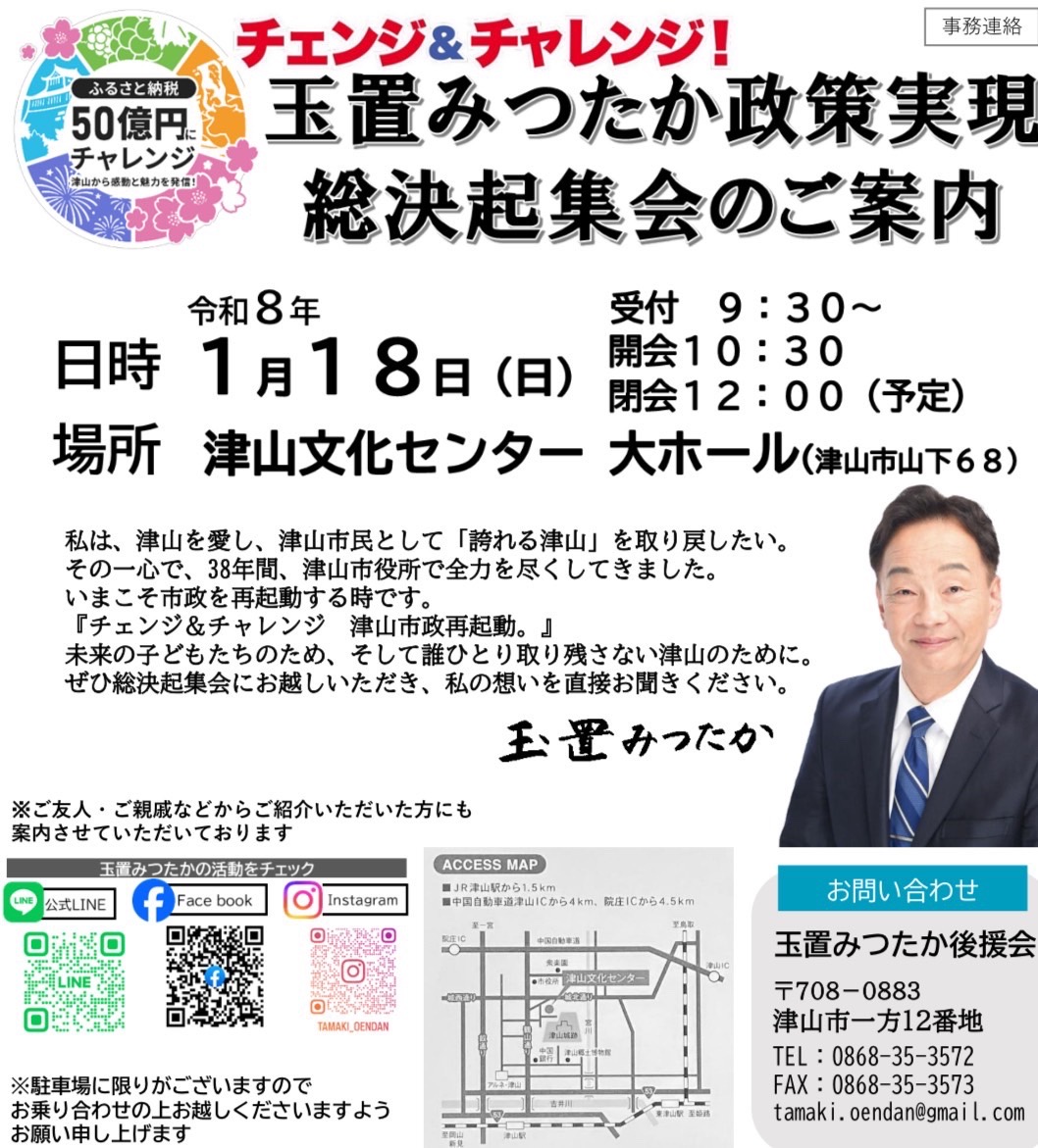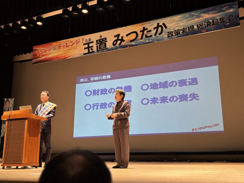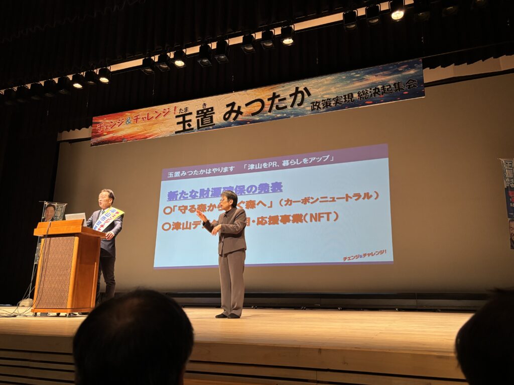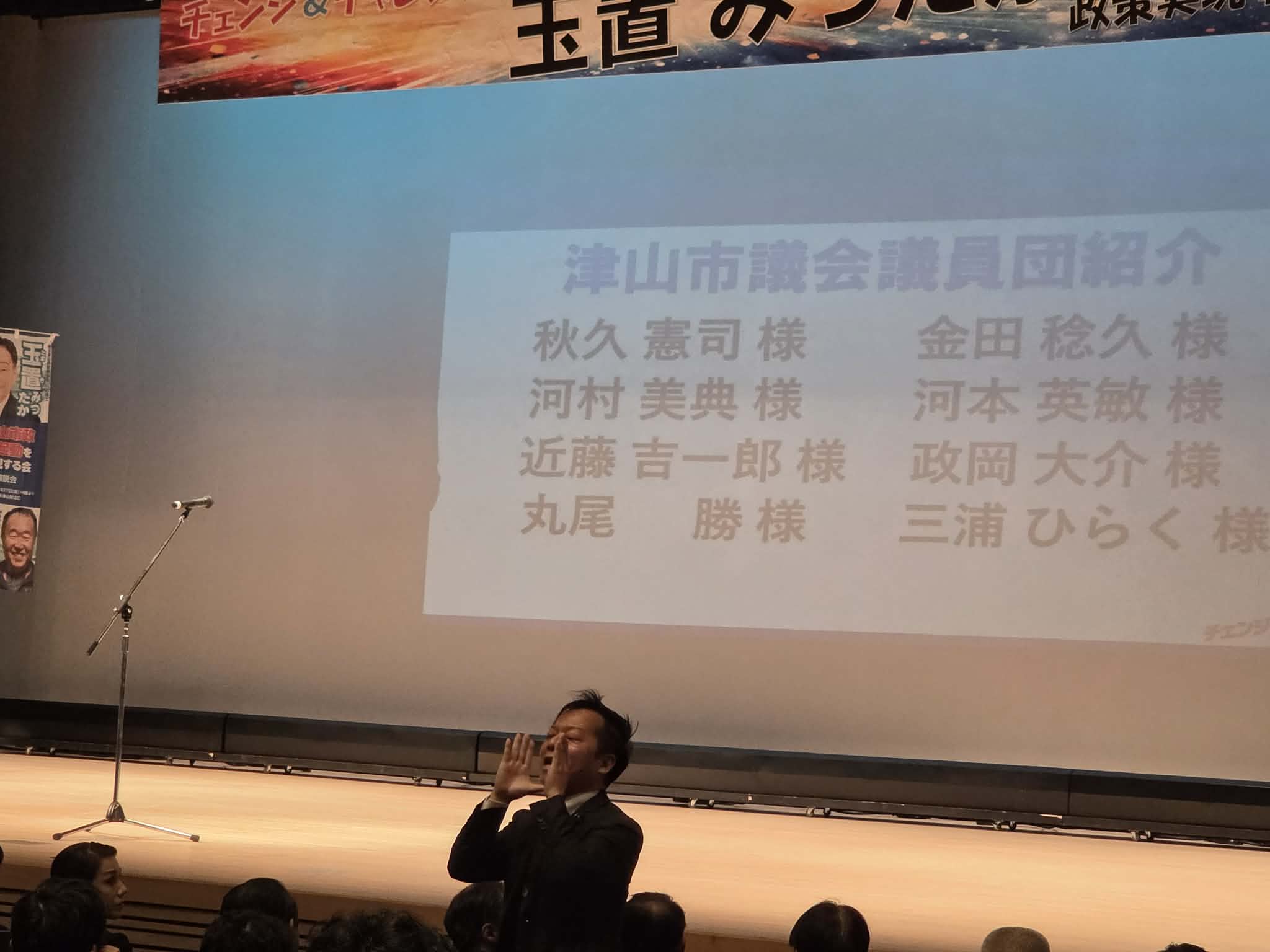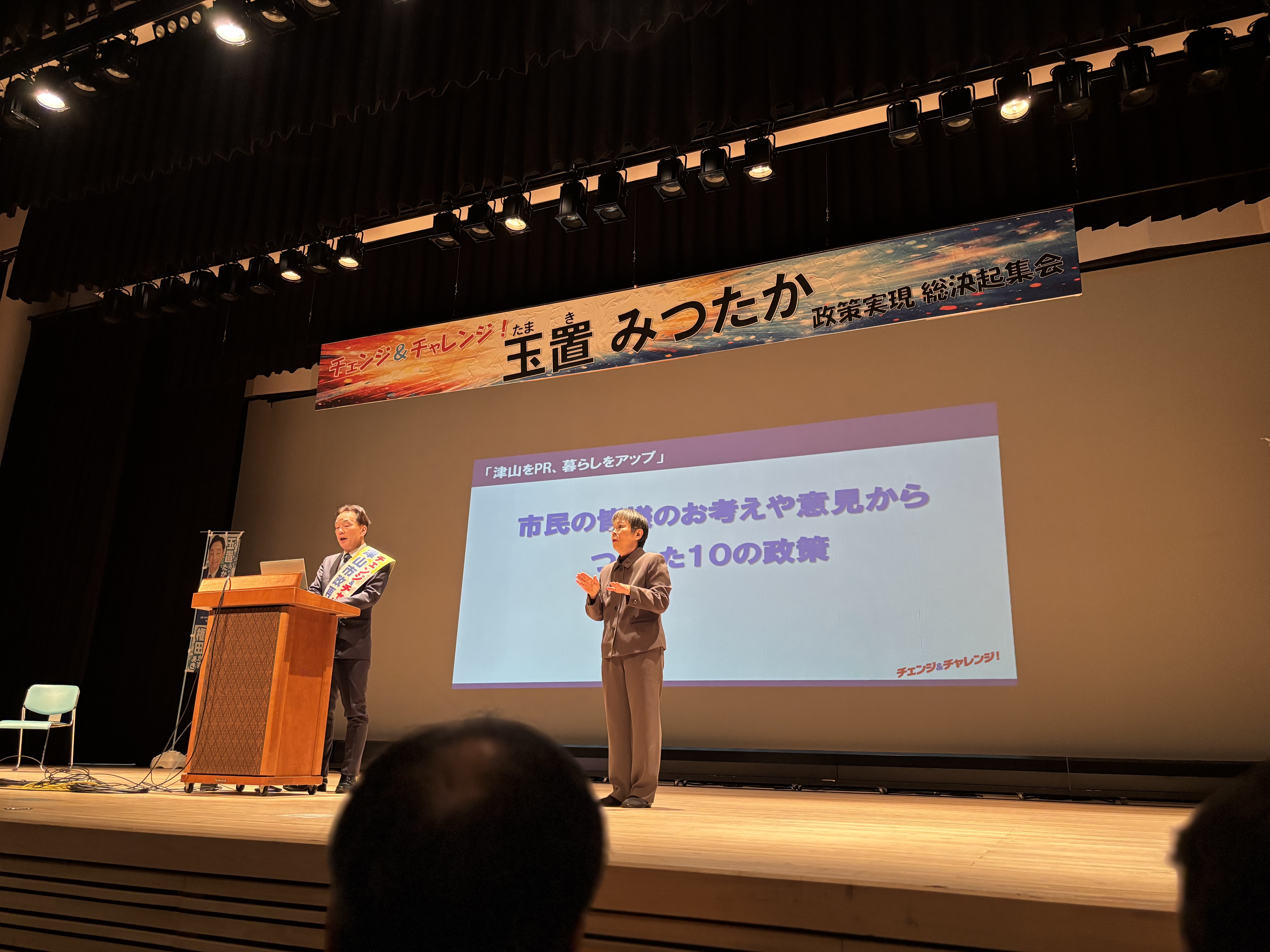 本日は、怒涛のハードスケジュールでしたが…メイントピックは何と言っても、津山市長選挙への挑戦を表明されている、玉置みつたかさんの”政策実現総決起集会”でした。