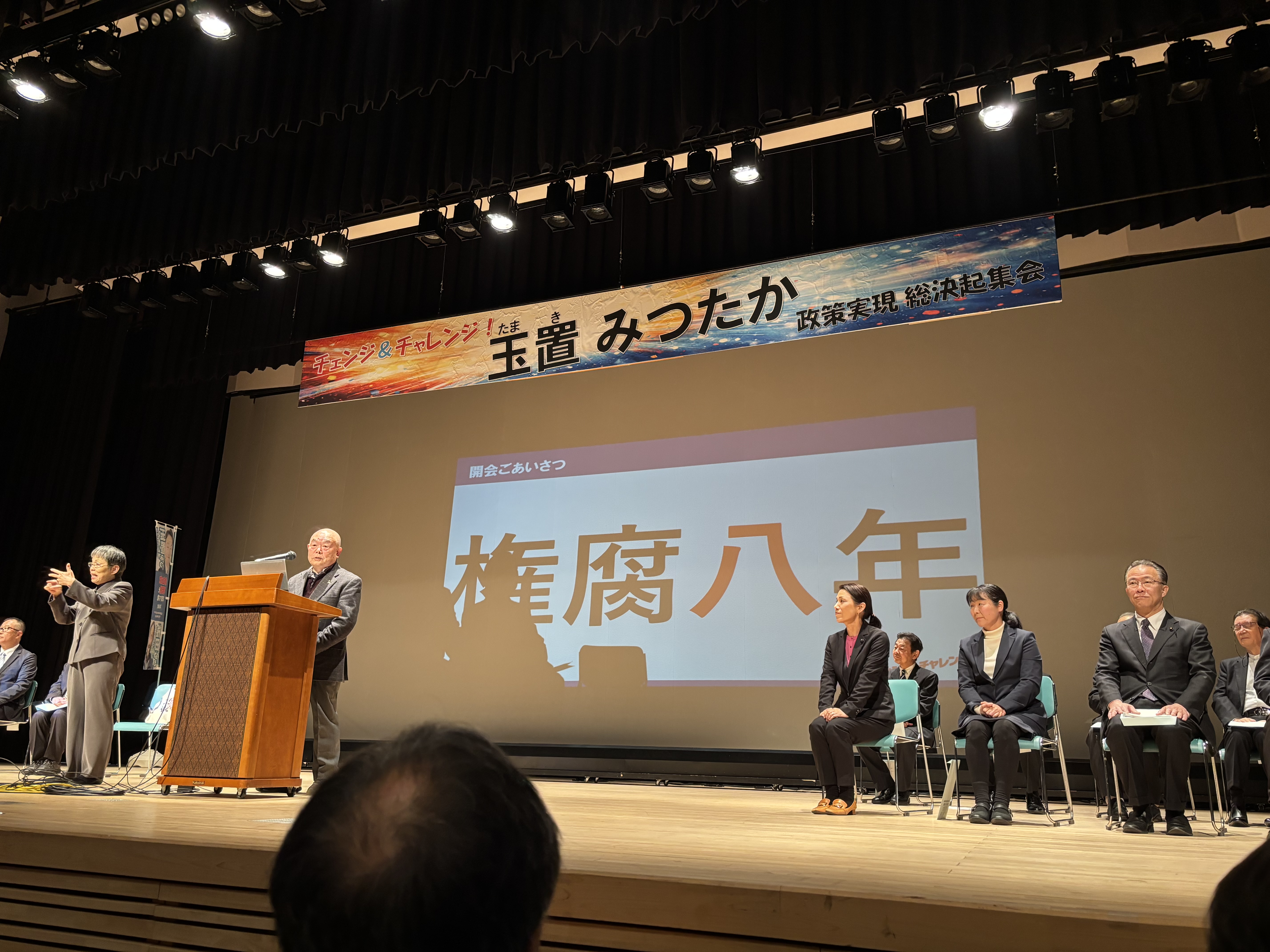 などと思いながら伺いましたが…これ、選挙に向けての「気合い入れていきましょう!」ってだけの会ではなくて…“本人の言葉で、現状認識→目指す姿→政策→財源”まで一気に語り切るタイプのやつでした…とは、書いてみたものの…こんなタイプの会には参加したことがないと感じています。そして先日の谷口圭三現市長の事務所開きにも、見たことがないくらいの多くの皆さまが集っておられた(約700名)ことを当ブログにも記していますが、1,000名以上が集っているとのことで衝撃を覚えました。実際、1,003席の文化センターはほぼ埋まっているように見え、非常に多くの皆さまが集っていたように思います。