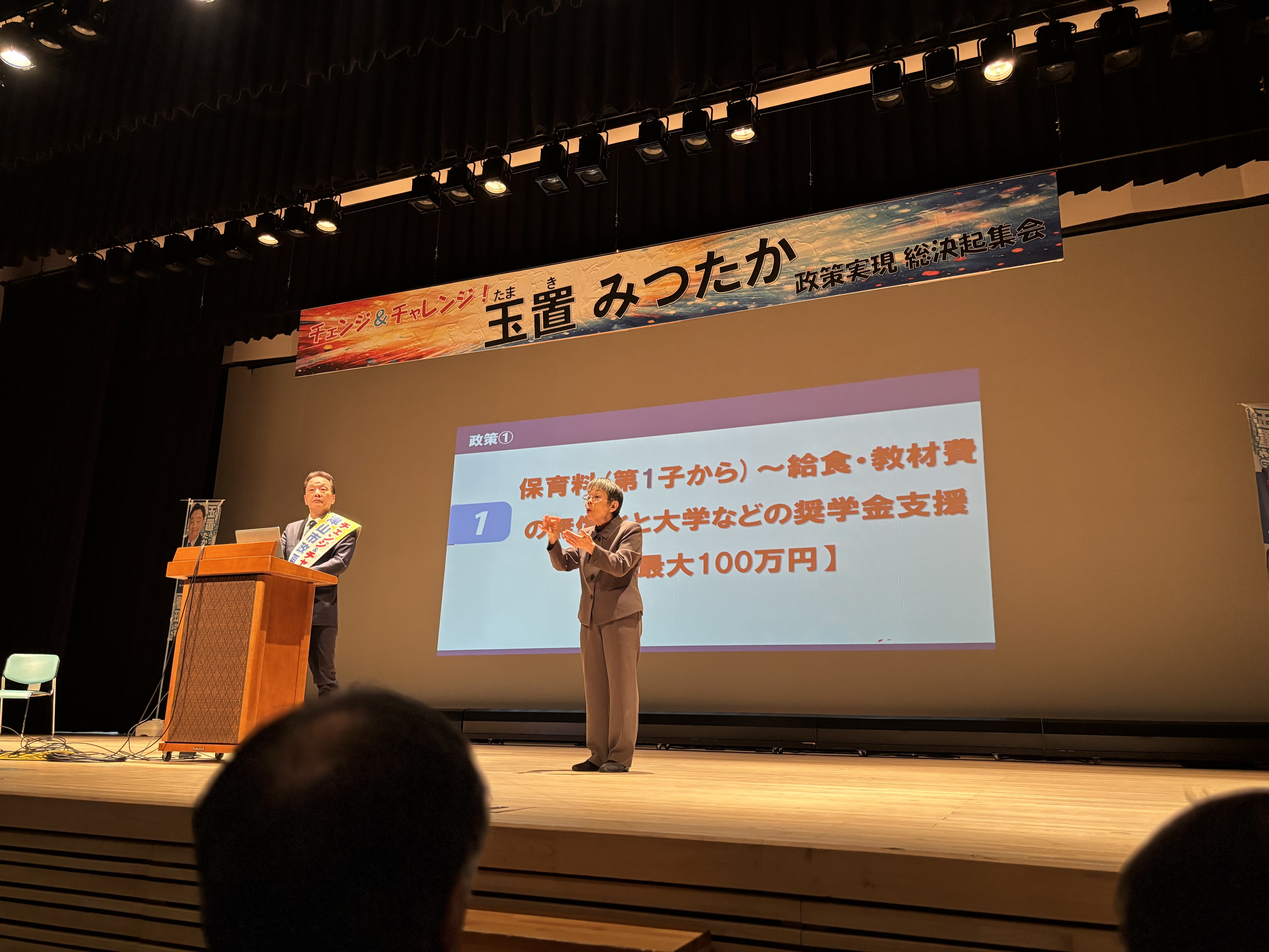 会の雰囲気は当然「いくぞ!」って印象なのですが、中身はむしろ、本人スピーチを中心に政策プレゼンとして組み立てられていた印象でした。自信があるからこそのスタンスかなと思います。生活に寄せた話が多かったので、「地味」と感じられた人もいたかもしれません。ただ逆に言えば、暮らしの課題をどう解いていくかを並べていたとも言えると思います。