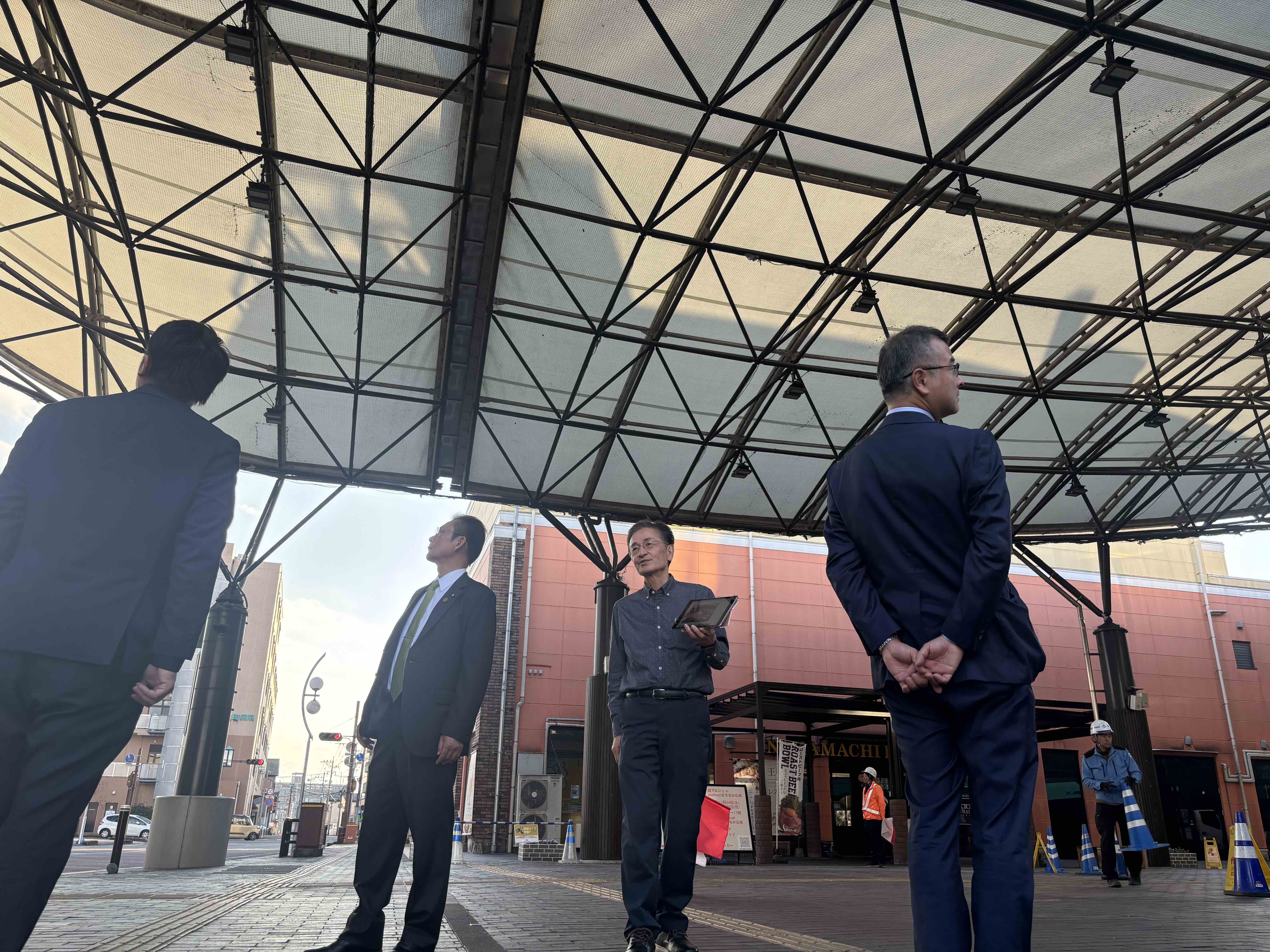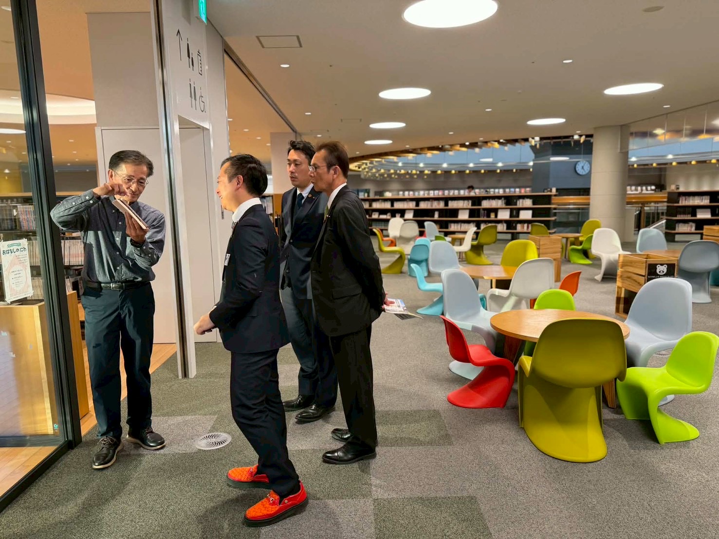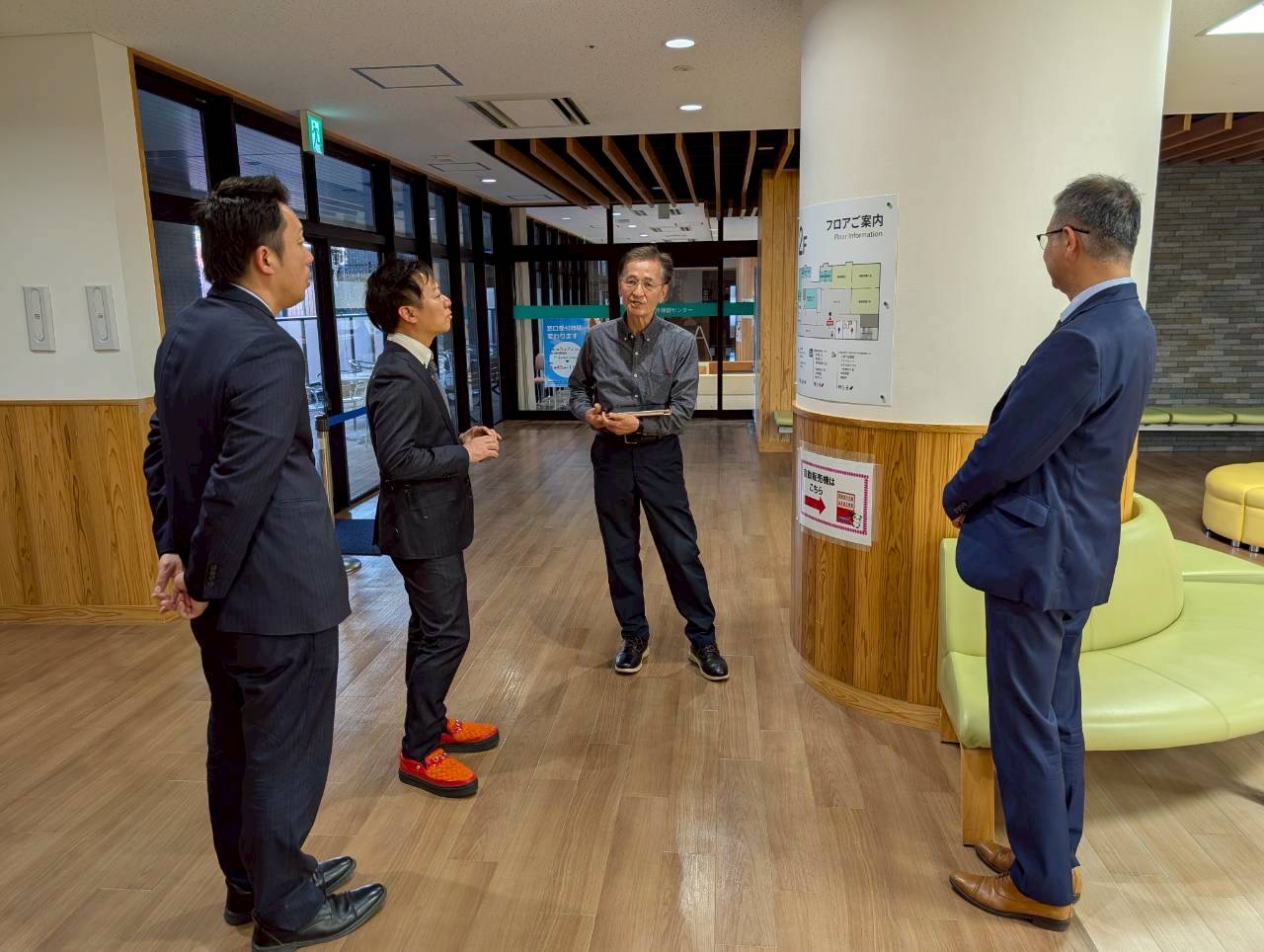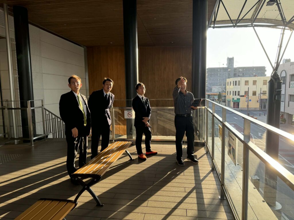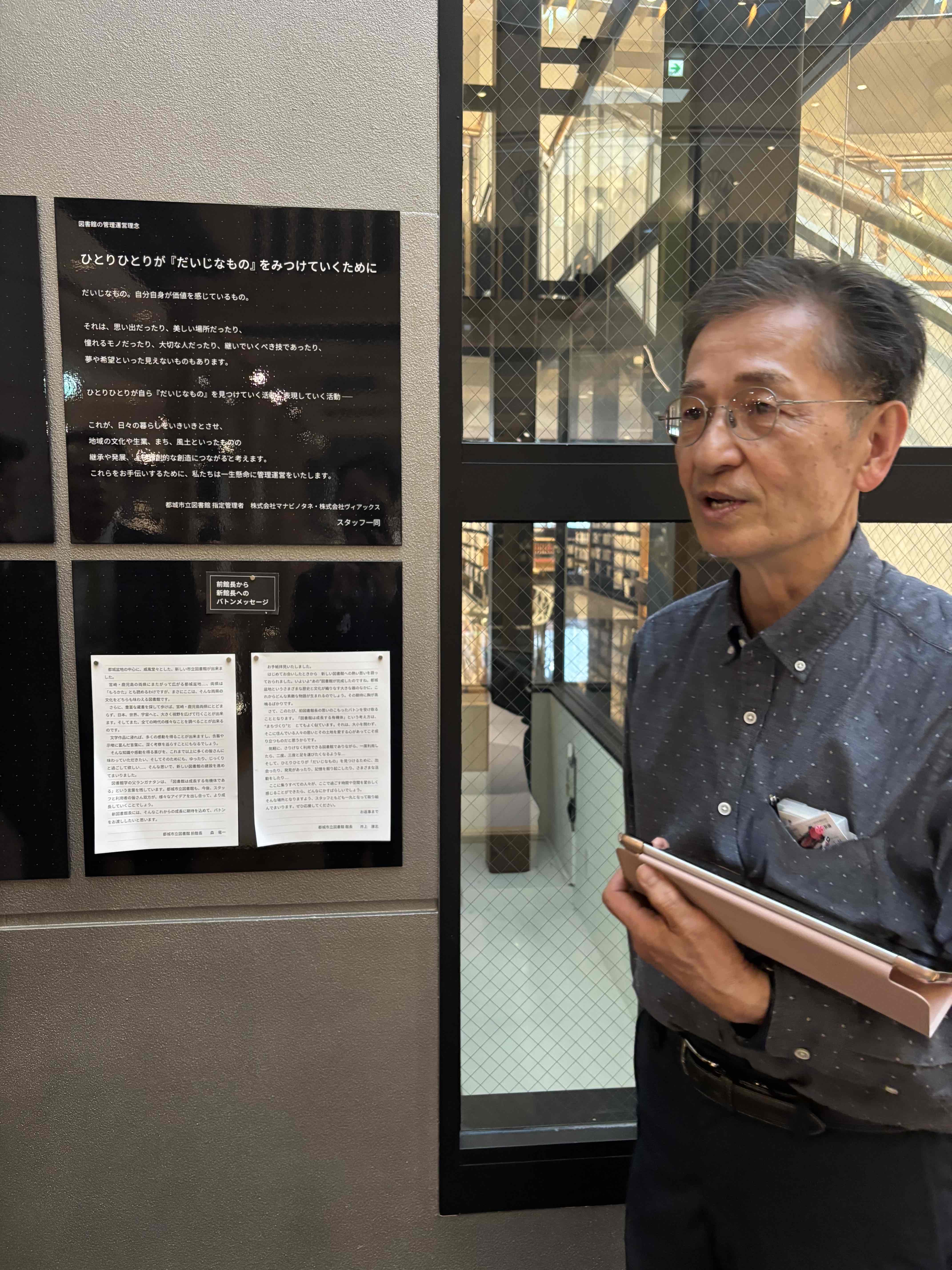 視察先においてお迎えし…ってのも何だか変な話ですし、松永先生は都城市を何度も訪れておられ、初訪問の3人よりもよほどお詳しいわけです。何とその上…何とも有難いことに今回は特別に、私たちの視察趣旨などを確認くださった上で…都城市立図書館をはじめ、様々な施設がテナントとして入った極めて興味深い複合施設、Mallmall(まるまる)の案内を予め、松永先生ご自身が旧知の間柄である井上康志図書館長にお願いしてくださっていたのです。