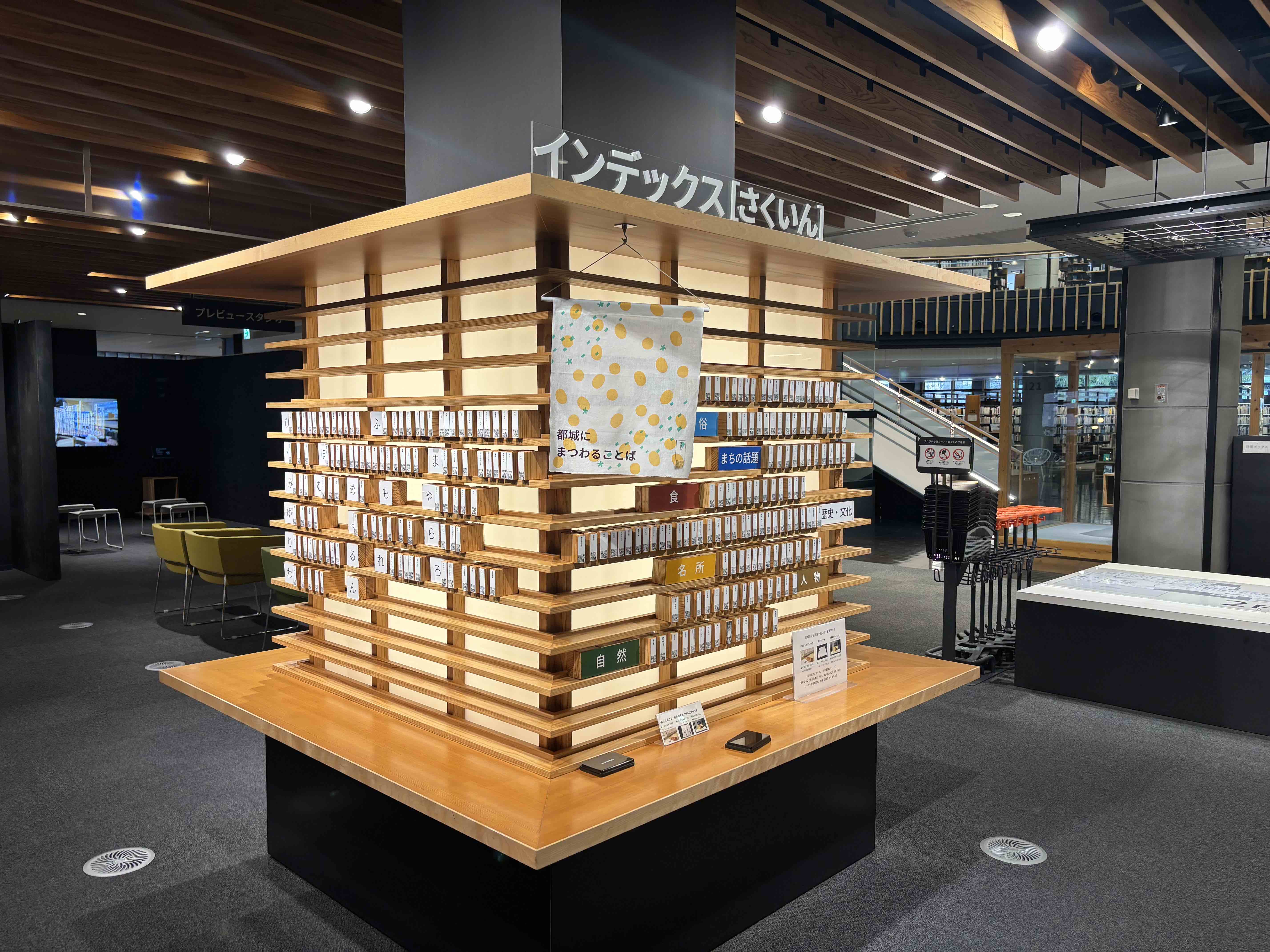 さらに特徴的なのが、図書館内に相談機能(相談デスク/そうだんカウンター)を明示し、調べ方そのものを支えること、そして「知る」と同時に「表現する」を支援するプレススタジオ(レーザーカッターやエスプレッソ・ブック・マシンまで!)を持っていることです。利用者が地域の情報を編集・共有し、展示や映像上映、ギャラリー、プロジェクトスタジオ等とも連動することで、図書館が地域の“情報編集局”として回り始めるわけです。インデックスワード(スタンプ+QR)や「だいじなものメモリー」(読んだ/気になる等のリスト化、ポイント蓄積)も、利用をゲーム化しながら学びを継続させる仕掛けで、他館ではあまり見ない設計だと思います。
