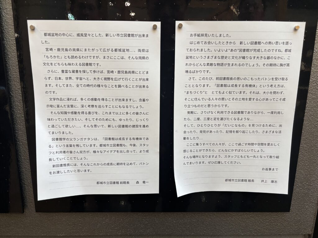 都城市の中心市街地はかつて百貨店(旧・都城大丸)などが核でしたが、撤退や衰退で空洞化が進んだとのこと。そこから起爆剤として、図書館等を含む拠点整備が本格化していった流れは、どこかのよく知っているまちを見ているような印象も覚えながら伺ったところです。
