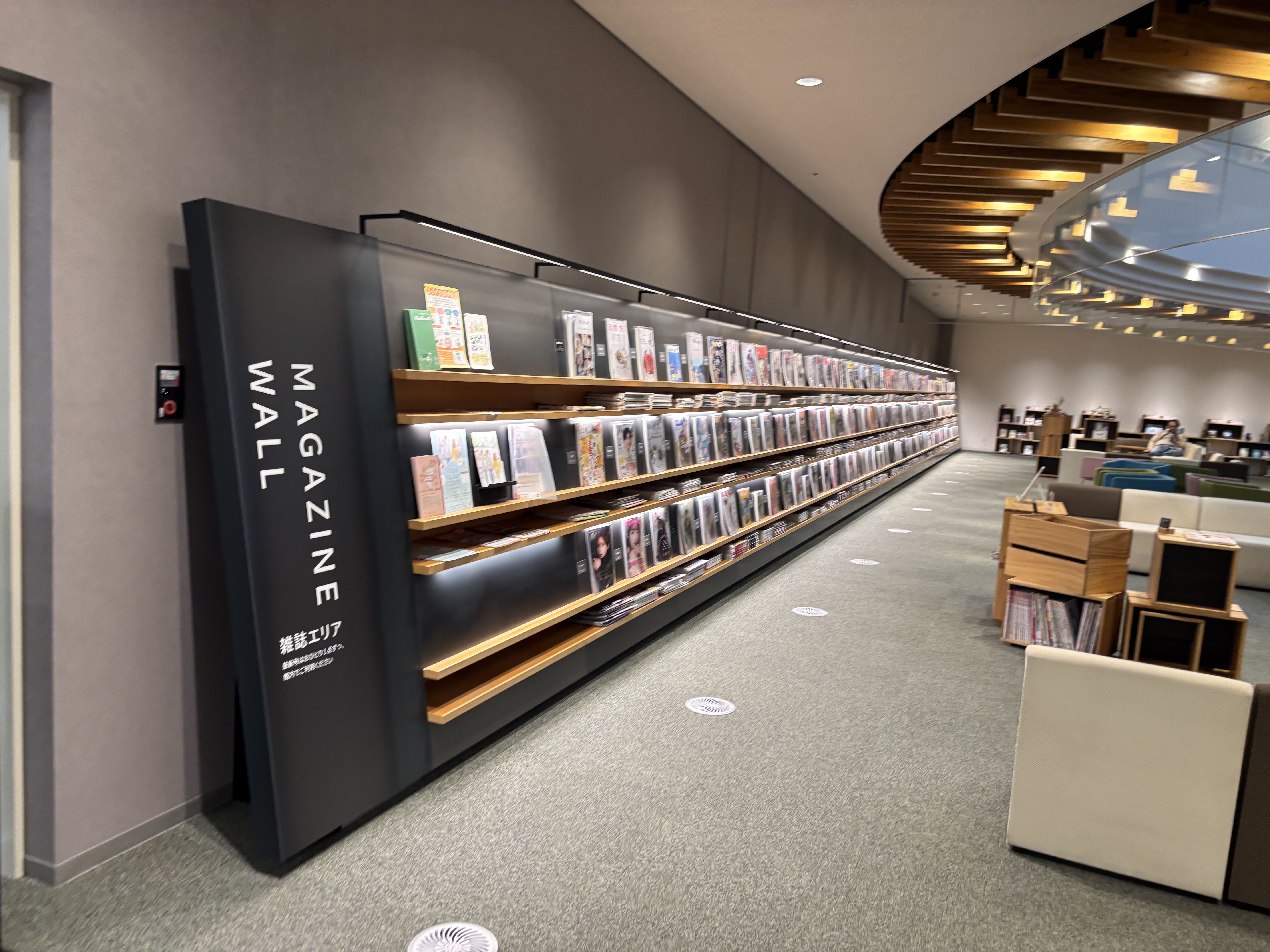 ここは一般的な「静かに本を借りる場所」という枠をはっきり越えて、まちの真ん中で“人の流れ”と“表現”まで生み出す装置になっていました。まず、ショッピングモールを図書館へ転用(コンバージョン)し、通路を“市場のストリート”に見立てて歩くだけで偶然の出会いが起きる空間に再設計しています。さらには壁で区切らず家具で場をつくり、木箱架やメッセージカードで直観的に本へ導くなど、滞在と回遊を企図したつくりは見事としか言いようがありませんでした。そして開館も9〜21時、定期休館なし、500席超・約30万冊規模で、中心市街地の“毎日の居場所”として成立する運用も非常に魅力的なものです。