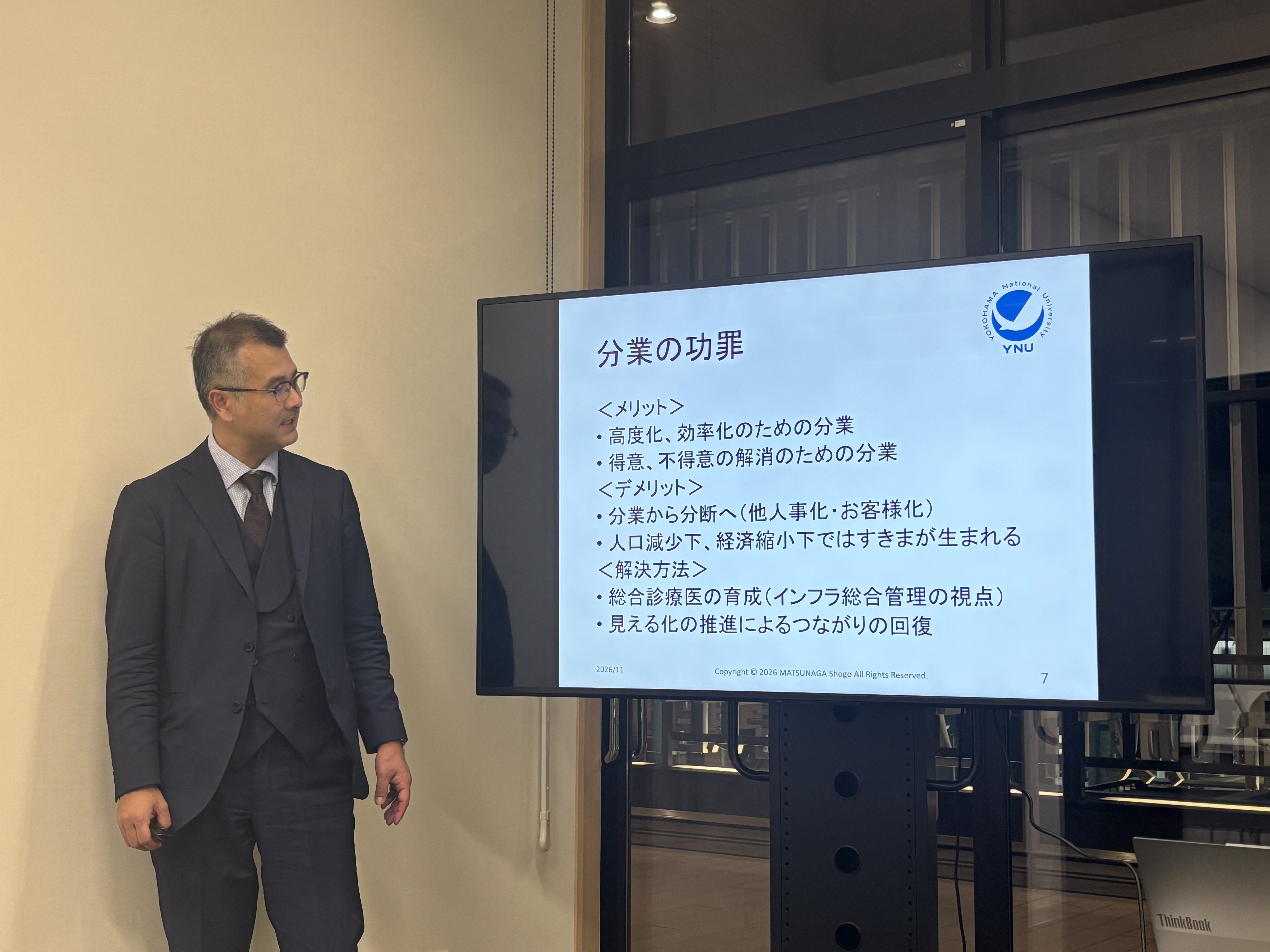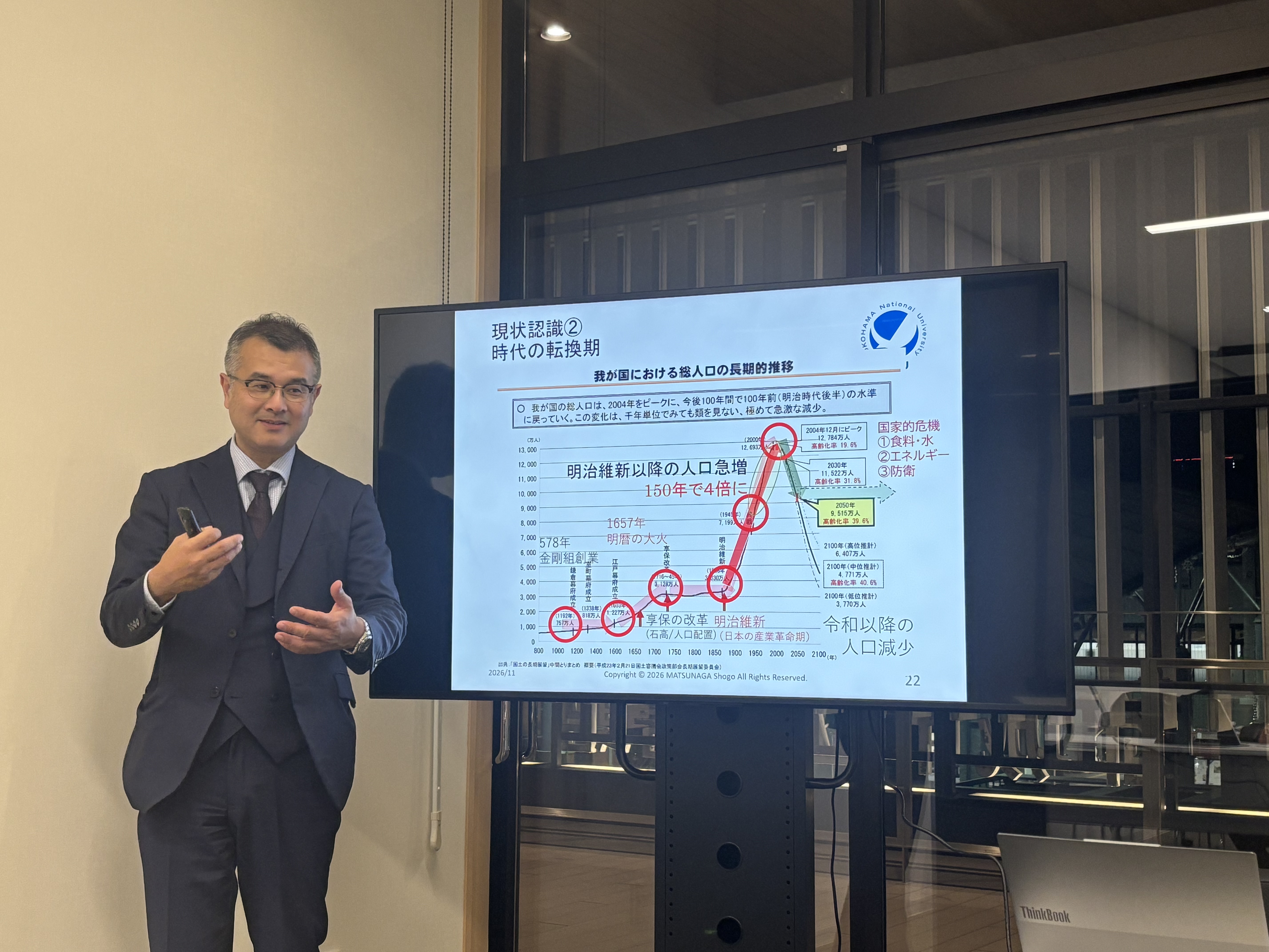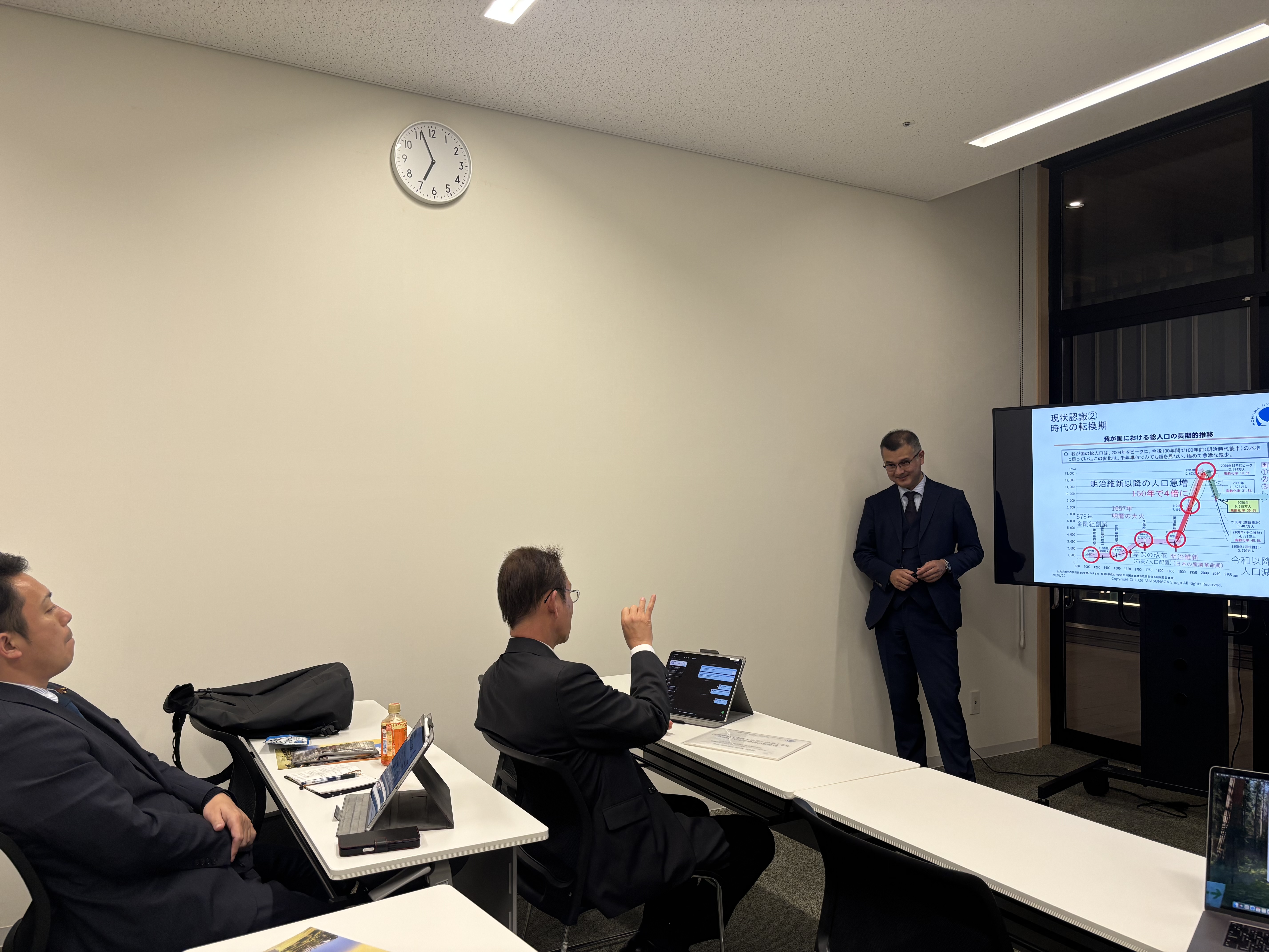 今回のお話は”人口減少時代の日本を破綻させないためにどうするか?”という極めて重い切り口で、しかも非常に多岐にわたる内容でしたので、当ブログの一記事でまとめ切るのは正直困難です。ごく一部の概要を抜粋して書かせていただきますが…松永先生のお話の上手さと、取り上げ方の巧みさで興味深く伺うことができました。圧倒的に豊富な知識と経験に裏打ちされた講義は、私たちにもわかりやすく、反応も見ながら非常に丁寧にお話しくださいました。