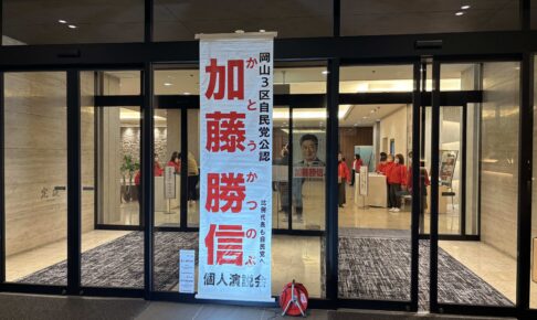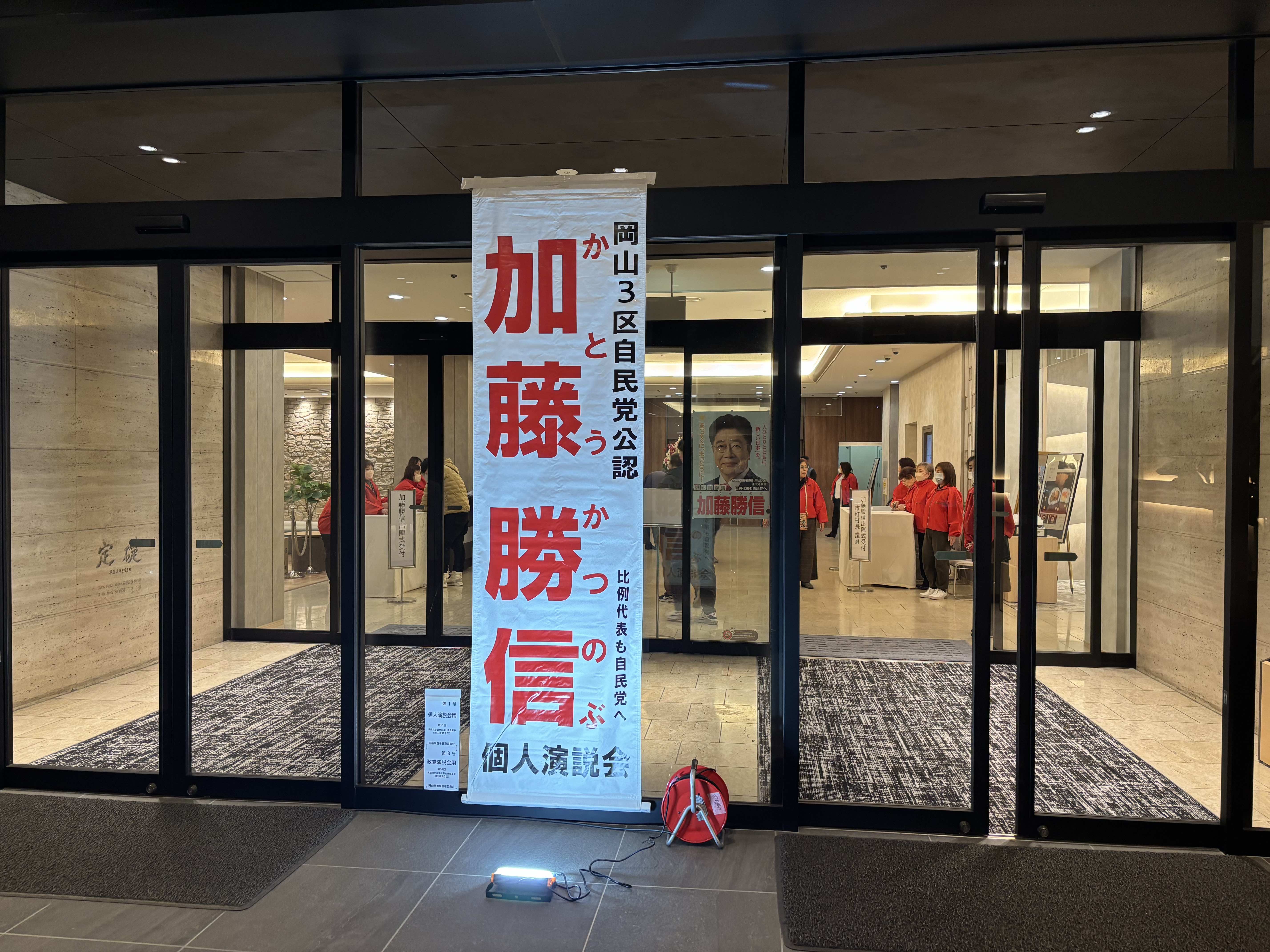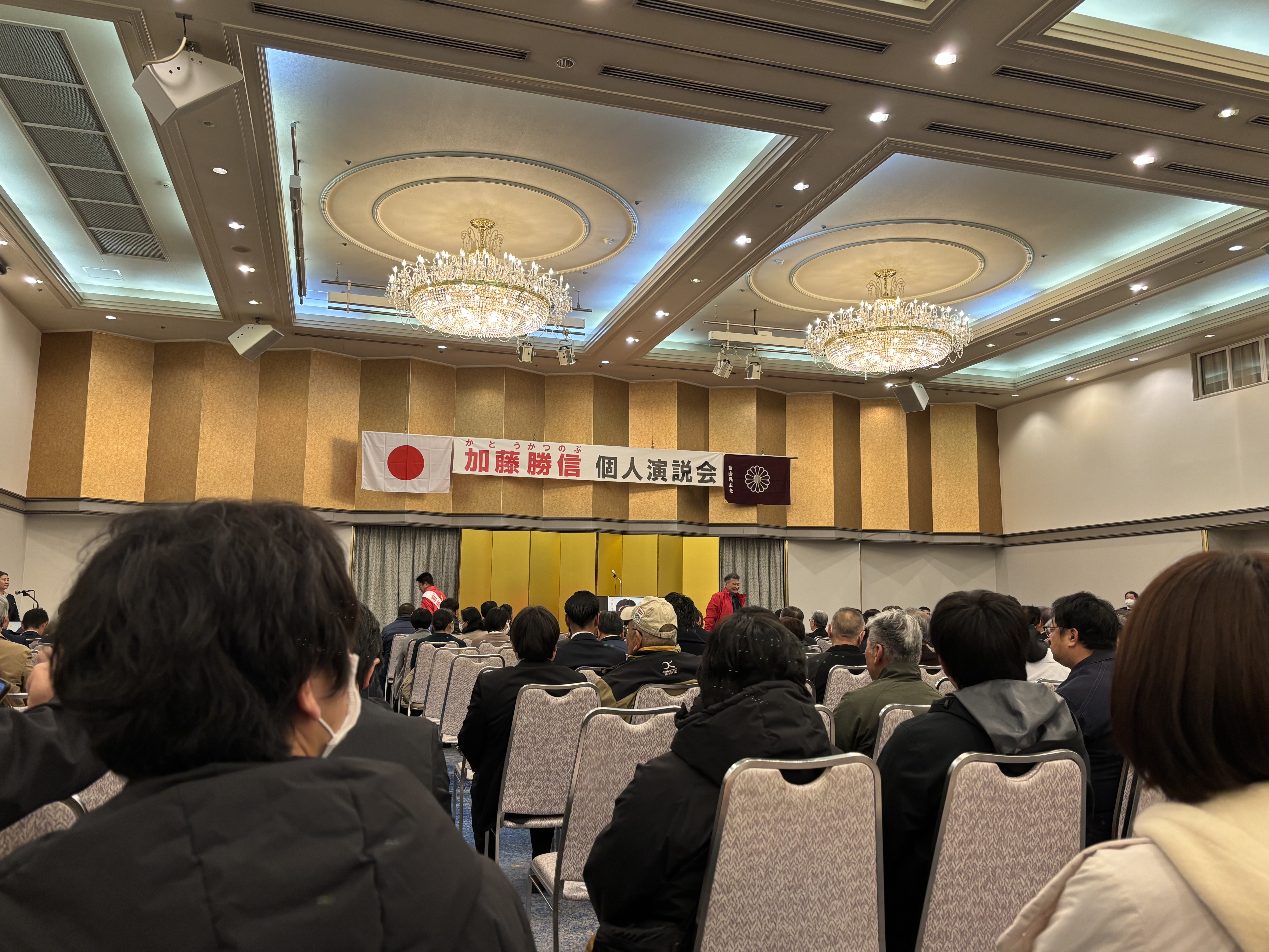 本日は寒さがガチで本気の中…芸術文化振興に携わっている方との意見交換市民相談などを経て、解散総選挙となったことを受け、津山鶴山ホテルで行われた加藤勝信衆議院議員の出陣式的な集会に参加させていただきました。座ってすぐ下の一枚の写真を撮影した直後にスマホの電池がなくなって、肝心の加藤さんのお話シーンなどの写真が一切ないのですが、急遽の開催にもかかわらず多くの皆さまが集まっておられました。