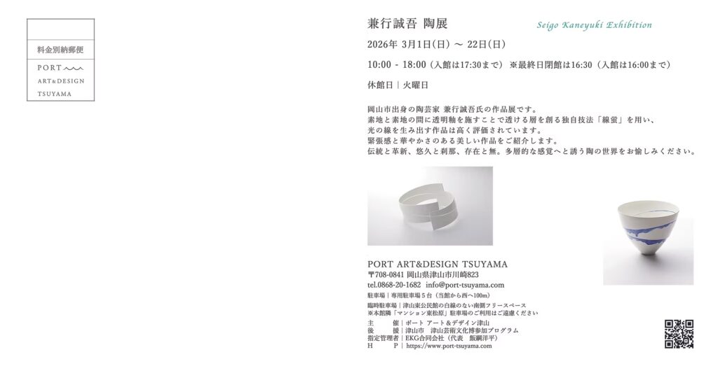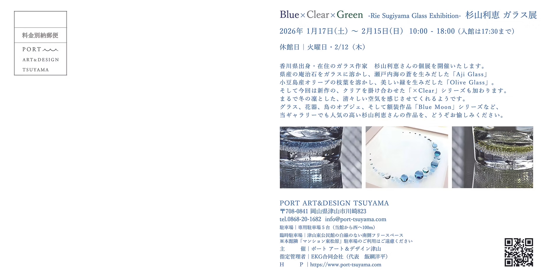 話は変わりますが、こちらも何度も紹介してきている、津山市川崎のPORT ART&DESIGN TSUYAMAに先日お邪魔してきました。現在開催中の杉山利恵さんのガラス展「Blue×Clear×Green」は、2月15日(日)までなので、気になっている方は、是非お早めにどうぞ!