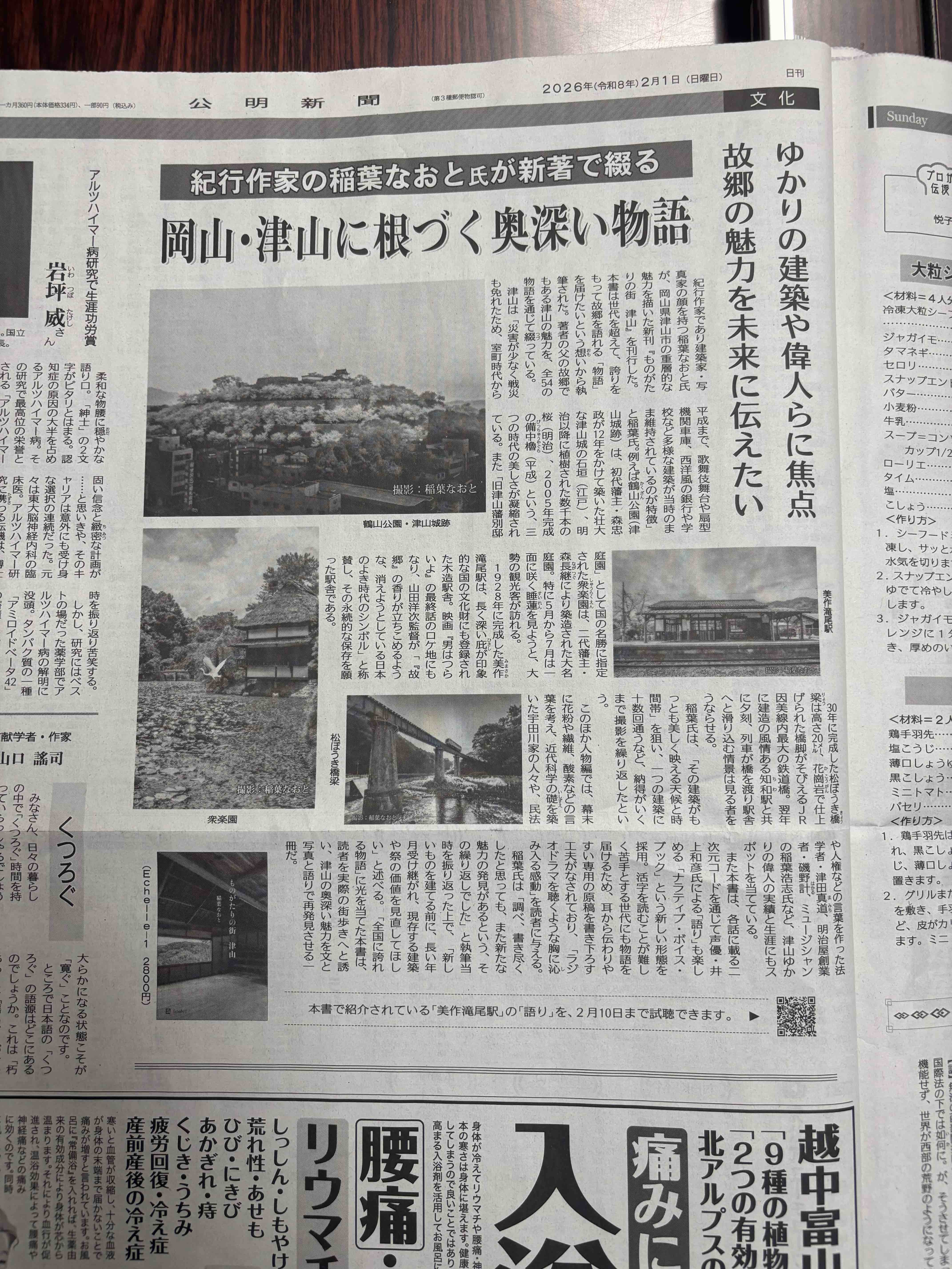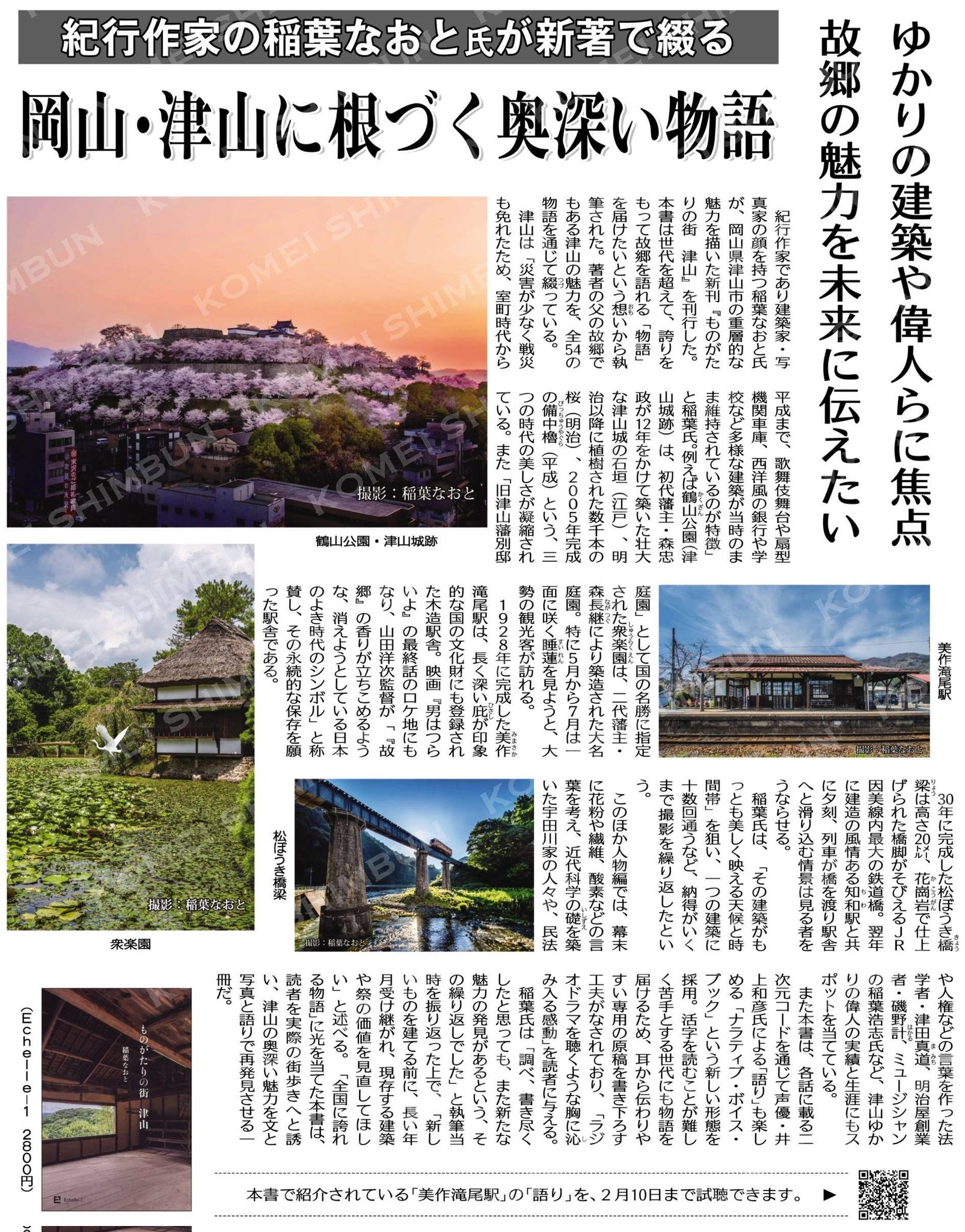 昨年11月に発売された岡山・津山に根づく建築や風景、偉人の足跡を手がかりに、「故郷の魅力を未来へ伝える」一冊であり、津山の自慢である鶴山公園(津山城跡)や衆楽園、美作滝尾駅などを、全54の物語として綴っているという…津山市民でなくても読んでみたくなる、津山市民であれば市外の人に贈りたくなるような、そんな内容になっていると思います。