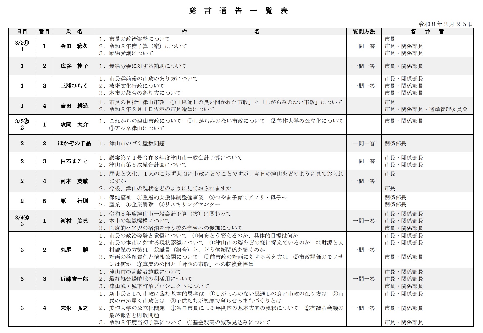 本日、早速に質問順も決定しています。今回は新市長の就任直後であり、先だっても書いたように予算案が骨格で示されていることから…平時の3月議会と比べると、あまり突っ込んだ質問がしづらいという事情があると思います。それゆえか、今回は質問に立つ議員の数がいつもより少なく、質問戦は3日間で終わる予定になっています。私自身を含めて質問通告を見てみても、どんな質問が展開されるのかは、イメージしづらいとは思いますし、何なのこの質問…って思ってしまうような通告内容もあるようなないような気がしますが、気のせいでしょう。