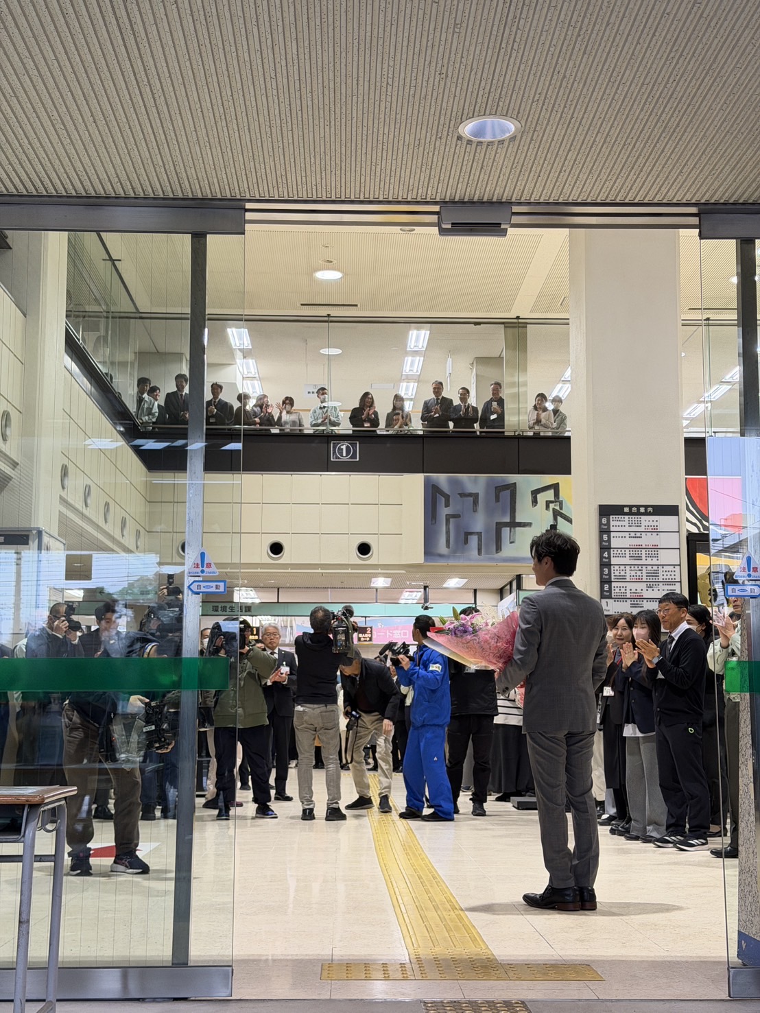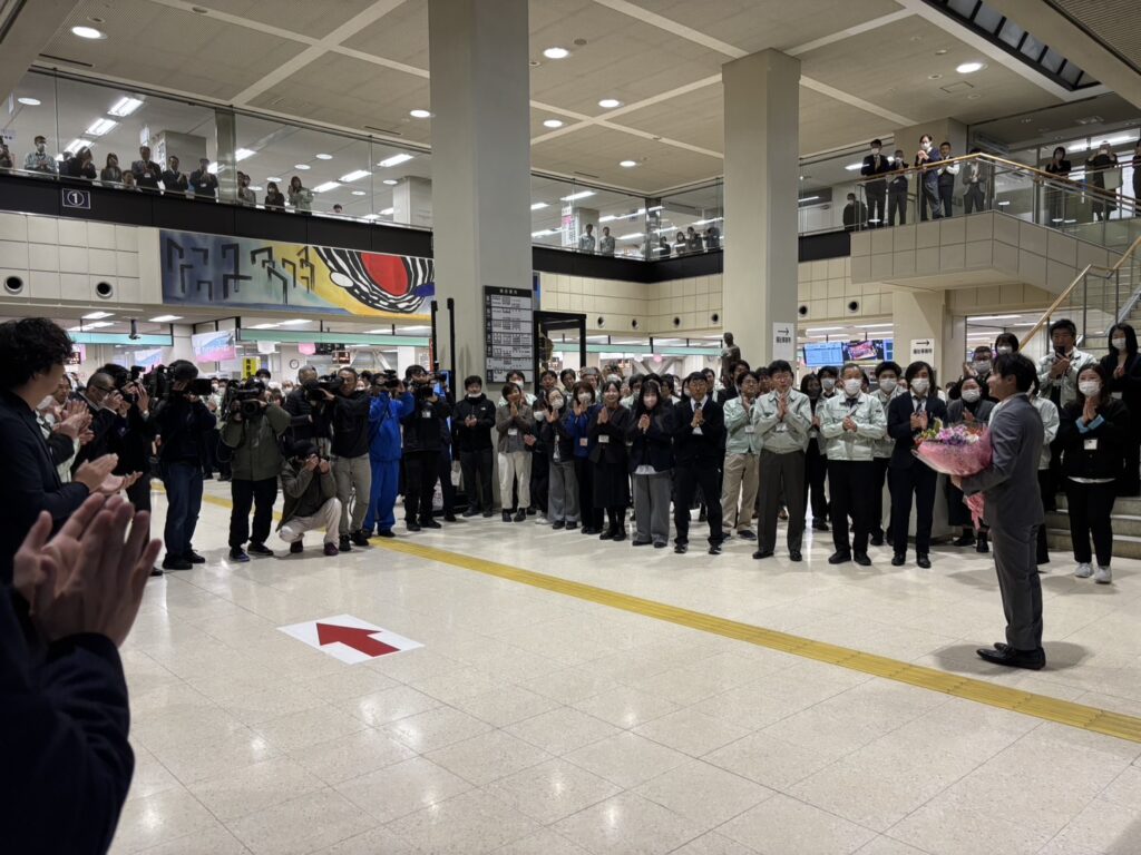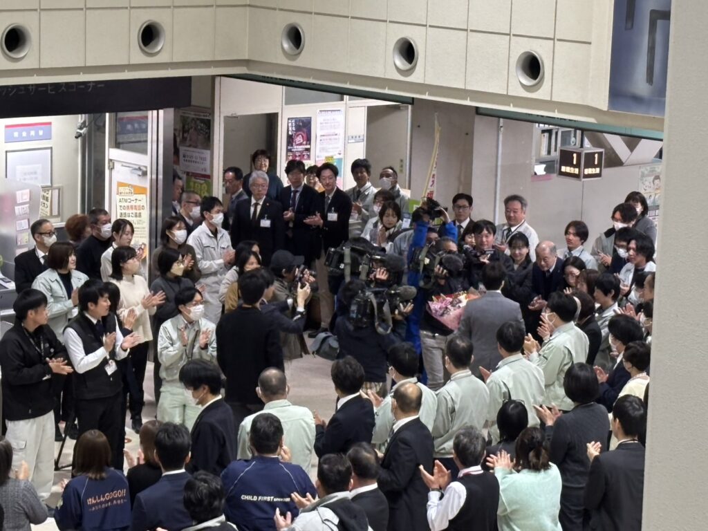 この出迎えは8年前に谷口市長が就任された際や、その8年前に宮地市長が就任された際などにもあったはずの光景ですが…感覚的に、2割増しくらい沢山の皆さまが出迎えられている印象だという声も聞こえてきました。多くの皆さまの期待の現れではないかなと感じました。