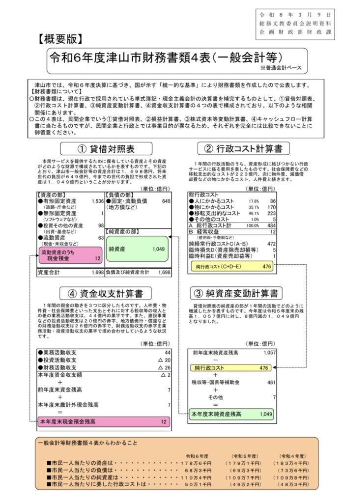 今までにも何年にもわたり、何回も質問内でも取り上げてきていることですが…財務4表についても、改めて触れました。超ザックリ言うと…財務4表とは、自治体の財政状況を4つの書類で整理したものです。単なる収支だけでなく、資産、負債、行政サービスのコスト、現金の流れまで含めて見える化できるのが特徴です。以下に本日示された概要版をシェアしておきます。