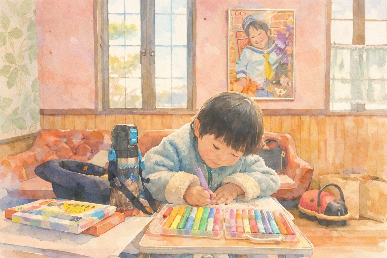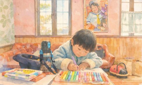 アイキャッチ画像は過日、幼稚園の帰りに事務所に顔を見せてくれた愛息が、お絵描きする様子でございます。