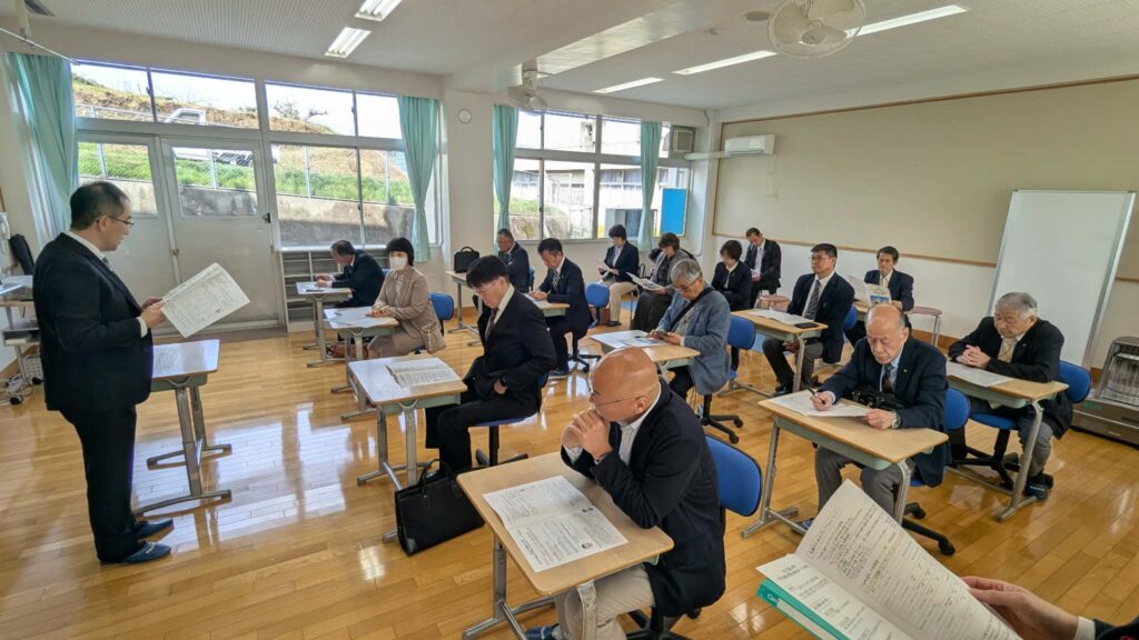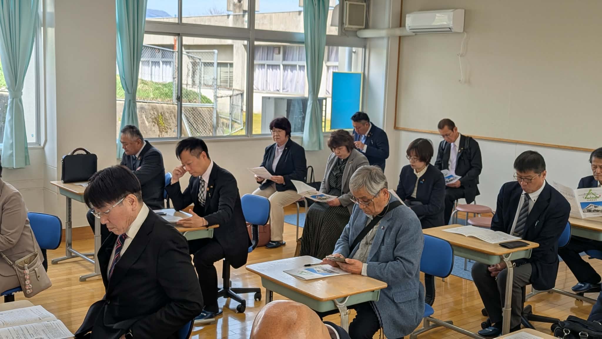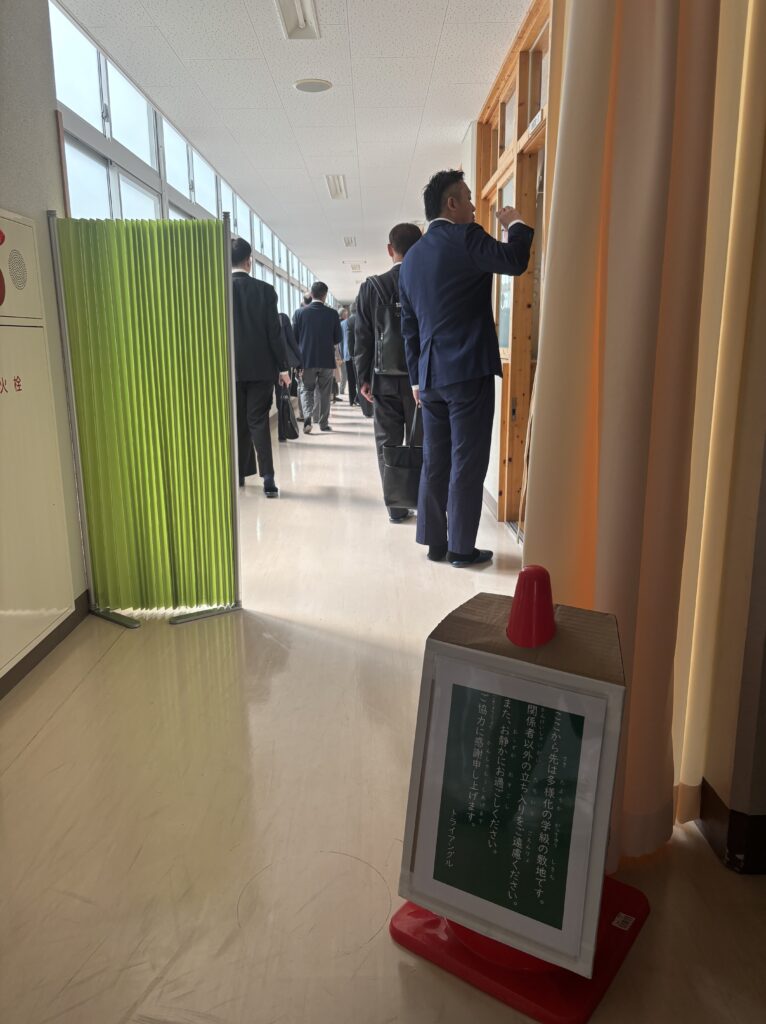 当初これは総務文教委員会のメンバーを中心に企画された視察でしたが、学級の性格上からも何度も視察に行くこと自体が好ましいことではないと考えられることなどから、何と総勢16名の津山市議会議員が、議会事務局からも3名の職員さんに出てきてもらって…3台の公用車に乗り合わせて、現地へと向かいました。まぁ市役所からだと歩いてでも行けるであろう距離ではありますが…自家用車で現地集合しては学校にも迷惑が掛かりますし、時間の都合などからも、むしろ効率重視で必要な対応だったと思います。