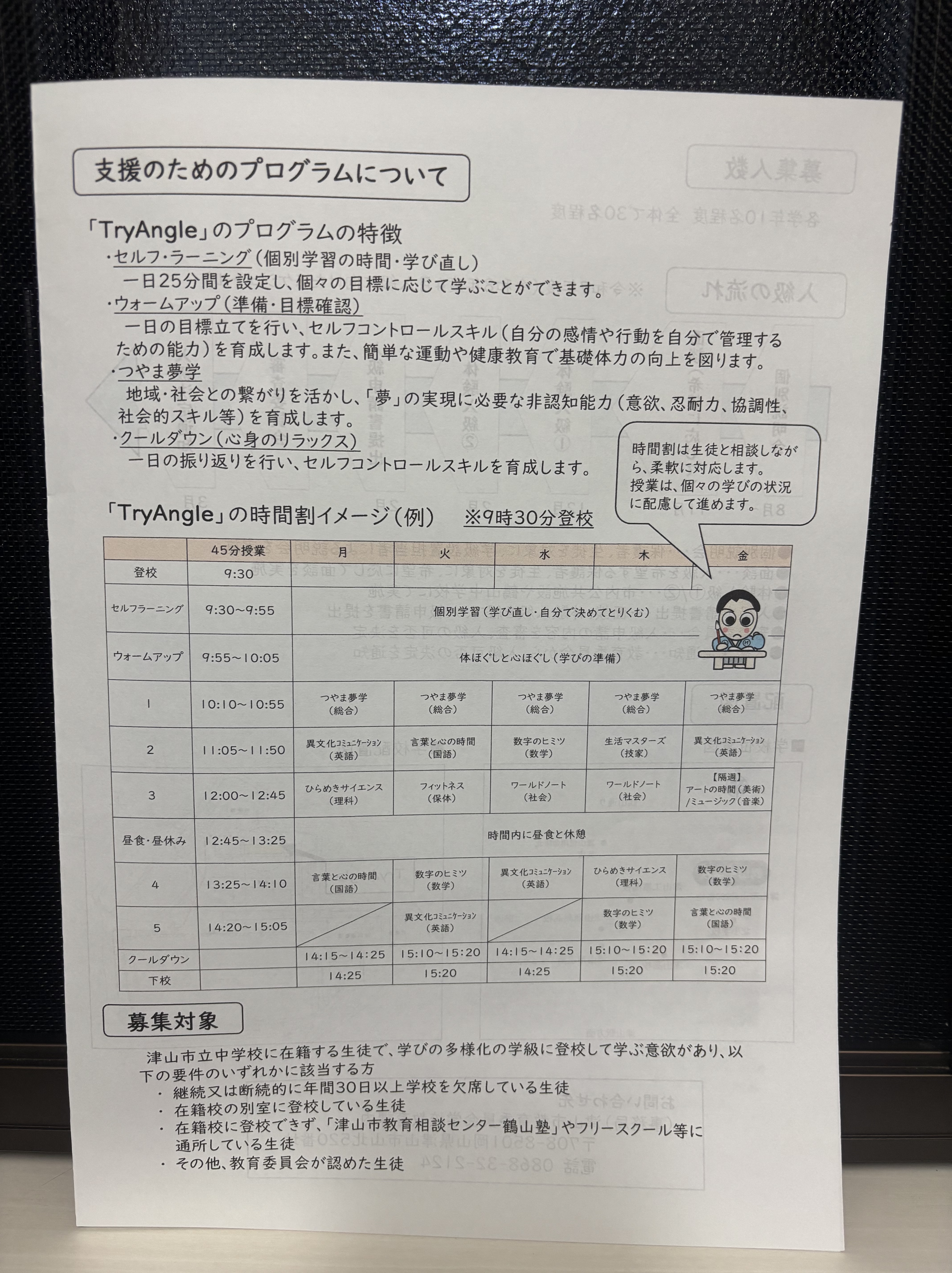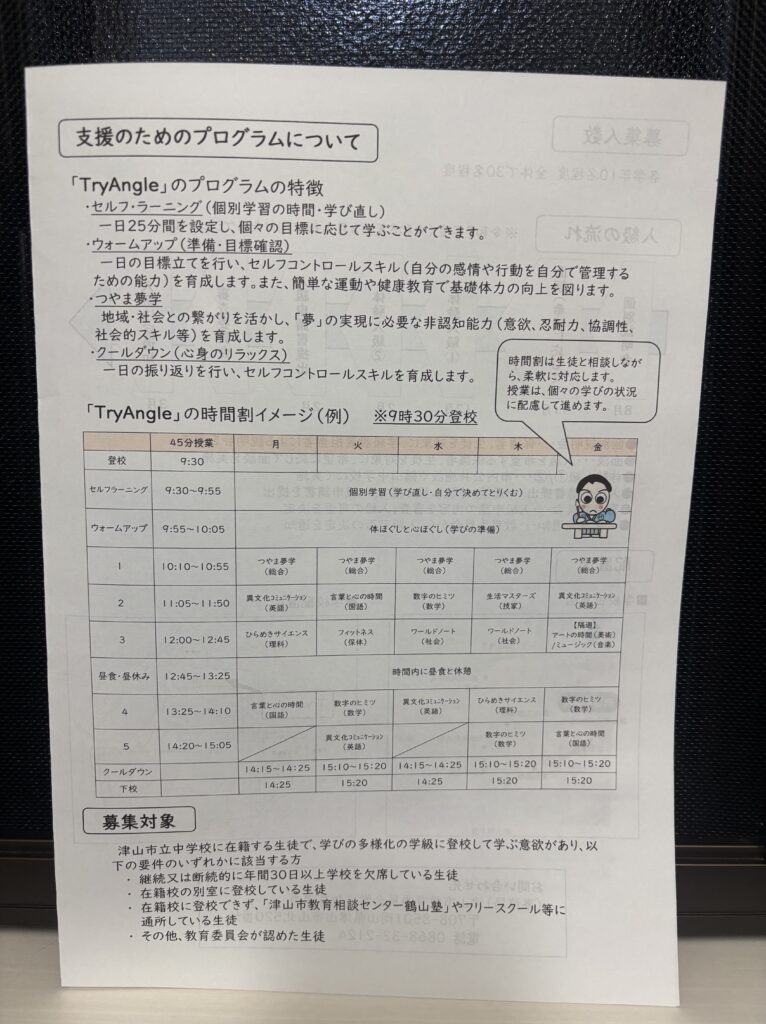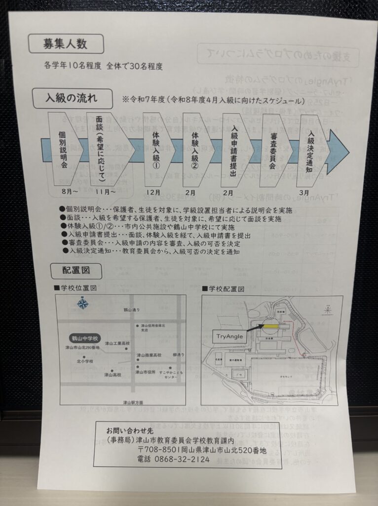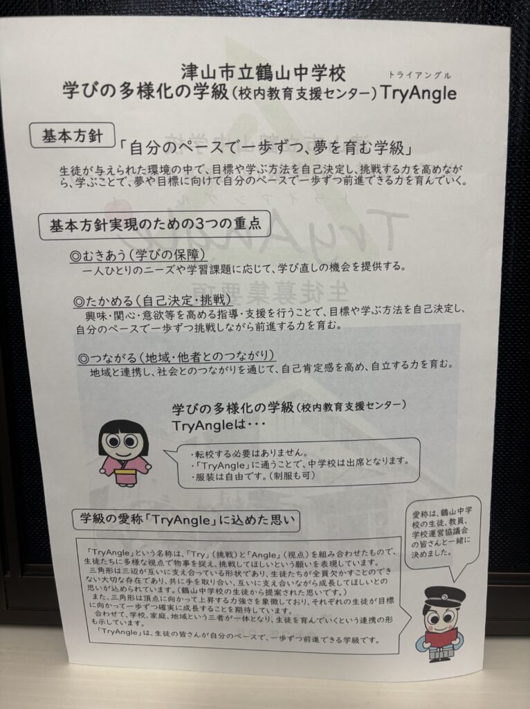 来月から津山市立鶴山中学校内に設置される、”学びの多様化学級”の現地視察に参加してきました。
