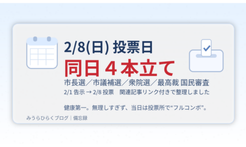 市長選&市議補選は明日告示で2月8日投開票!衆院選&国民審査も重なり津山は同日4本立て豪華メニュー。